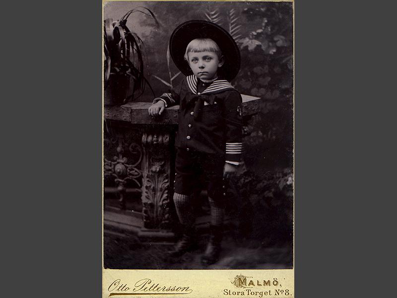 Visitkortsfotografi. Porträtt av Uno Otterstedt, stående vid stenmur. Ateljéfond utgör bakgrunden.
