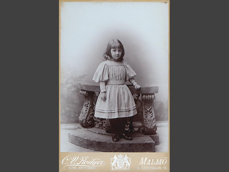 Visitkortsfotografi. Porträtt i helfigur av av Gunhild Adler, stående vid stenstaket med balustrad.