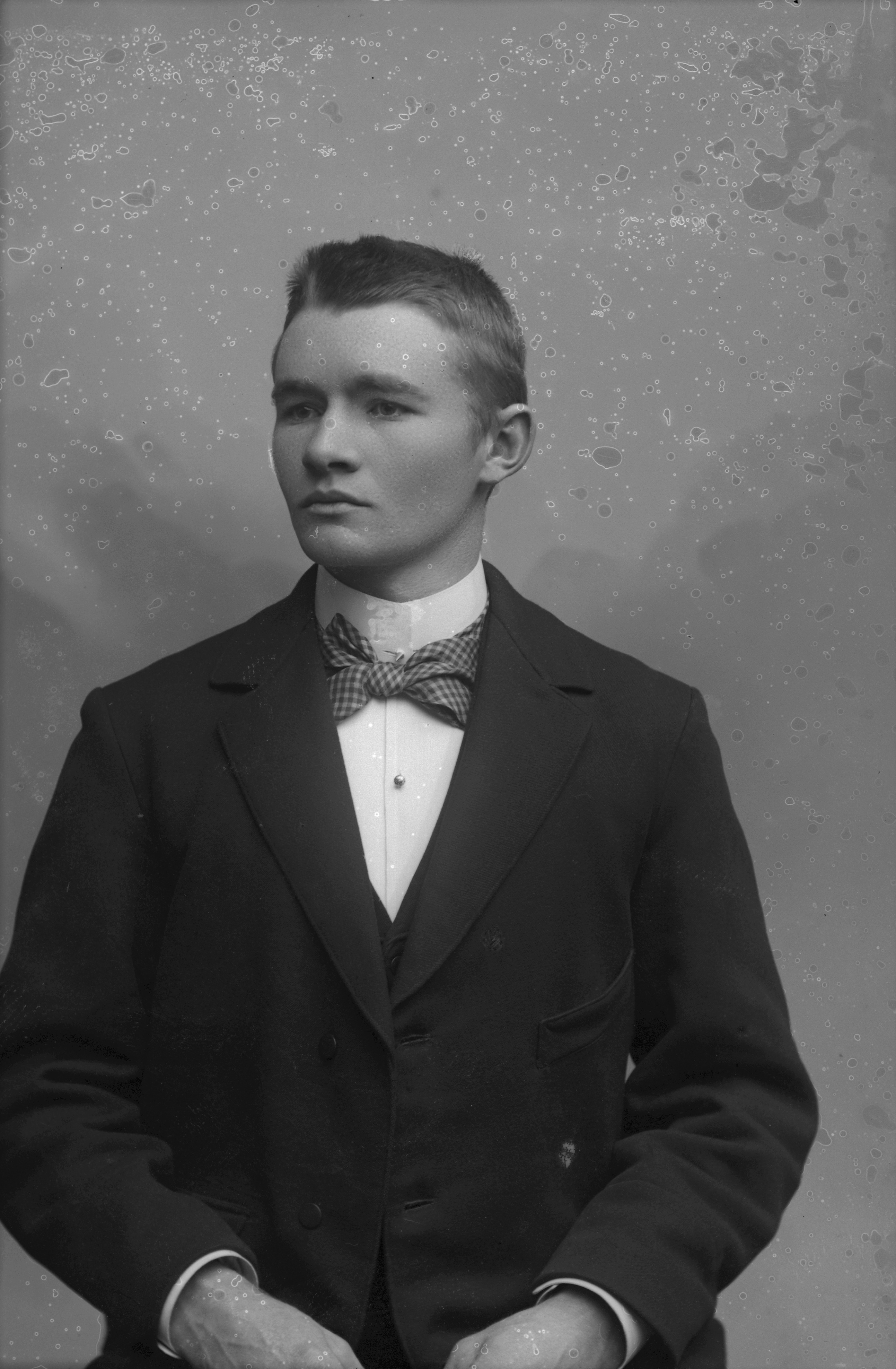 Beskrivning: Porträtt i halvfigur av lantbrukare H. Hermodsson.