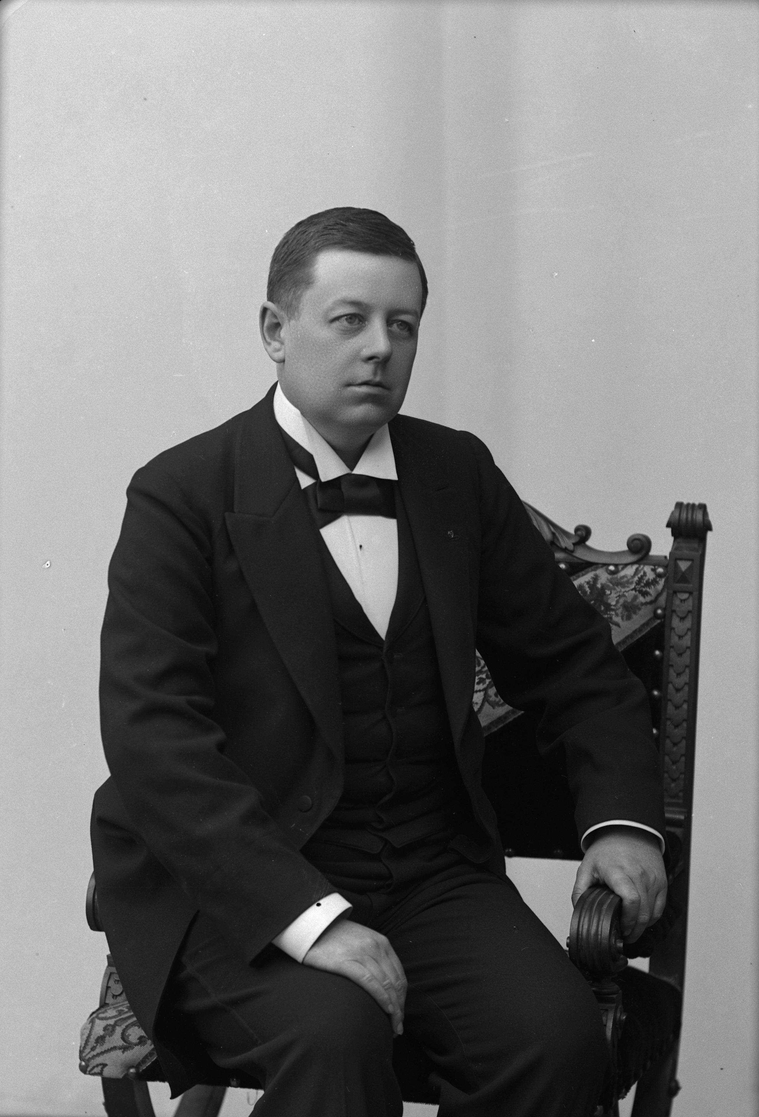 Porträtt i helfigur av herr Ljungberg, sittande i stol.