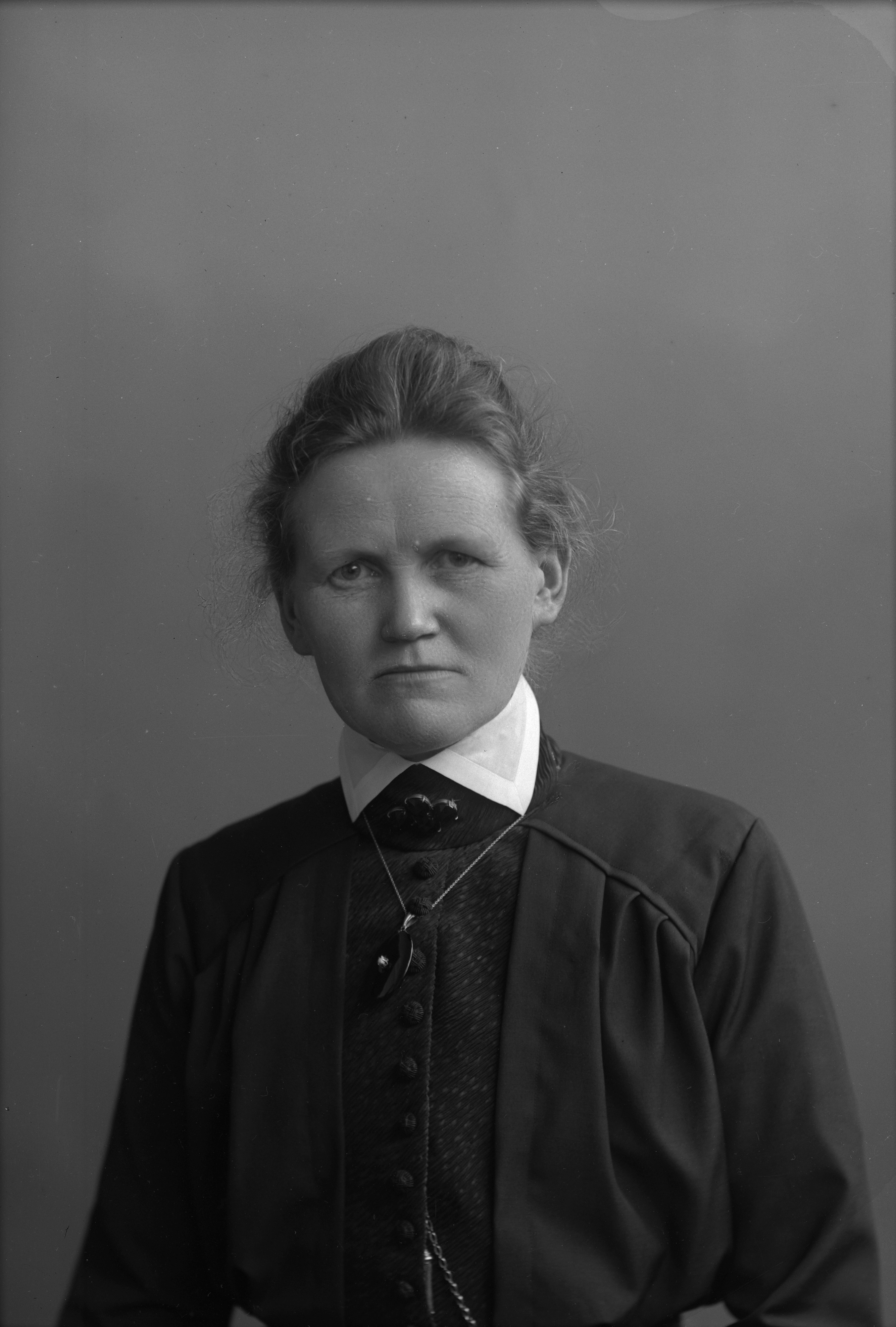 Porträtt i halvfigur av fröken Ohlsson, textilhandelsanställd.