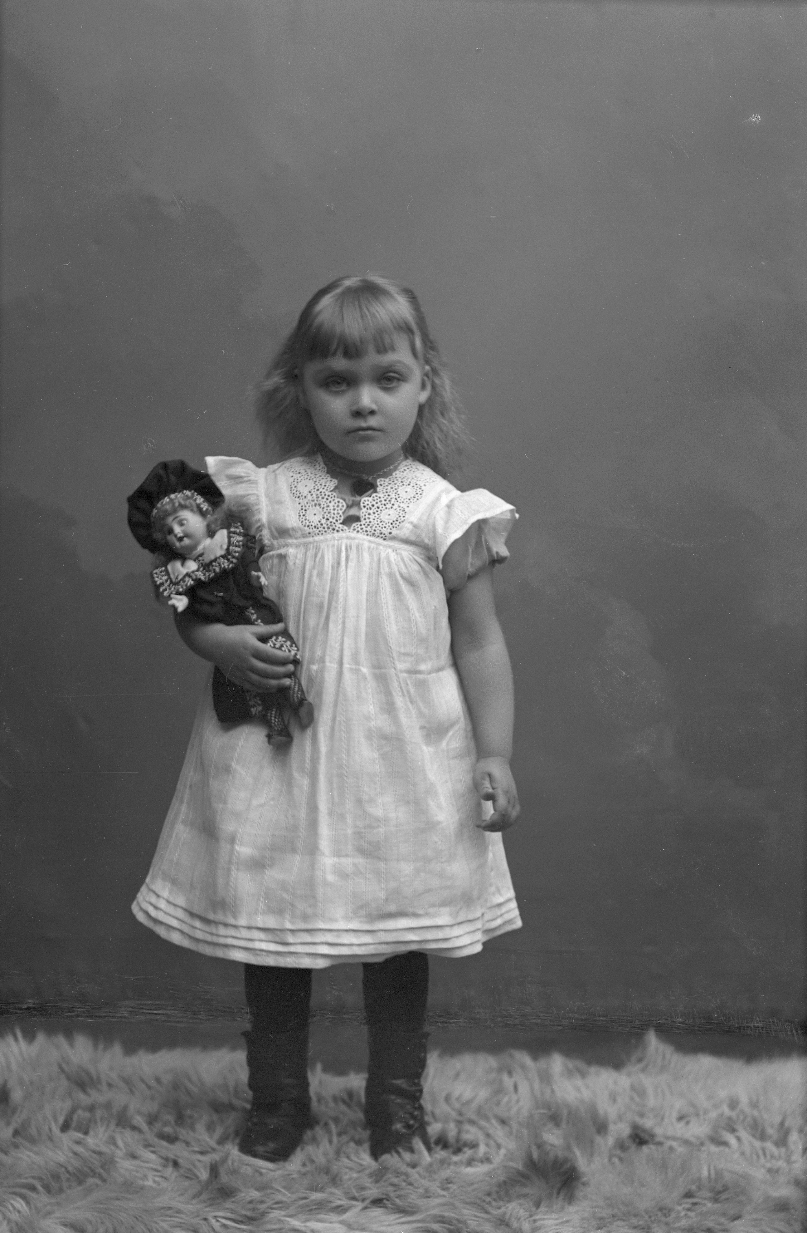 Porträtt i helfigur av herr Holmströms dotter, hållande docka.