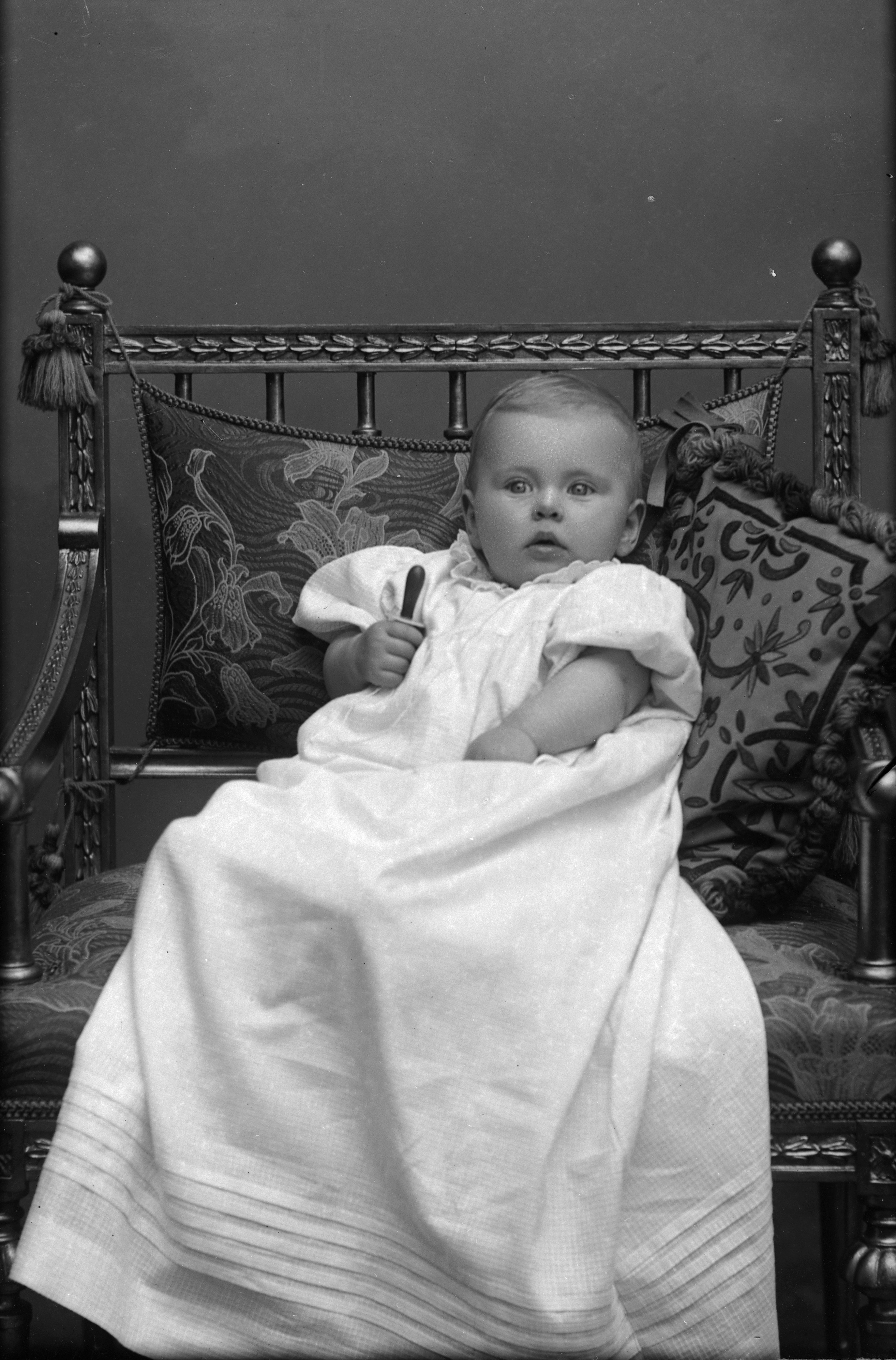Porträtt i helfigur av Christer Nilsdsons barn, iklätt dopklänning.