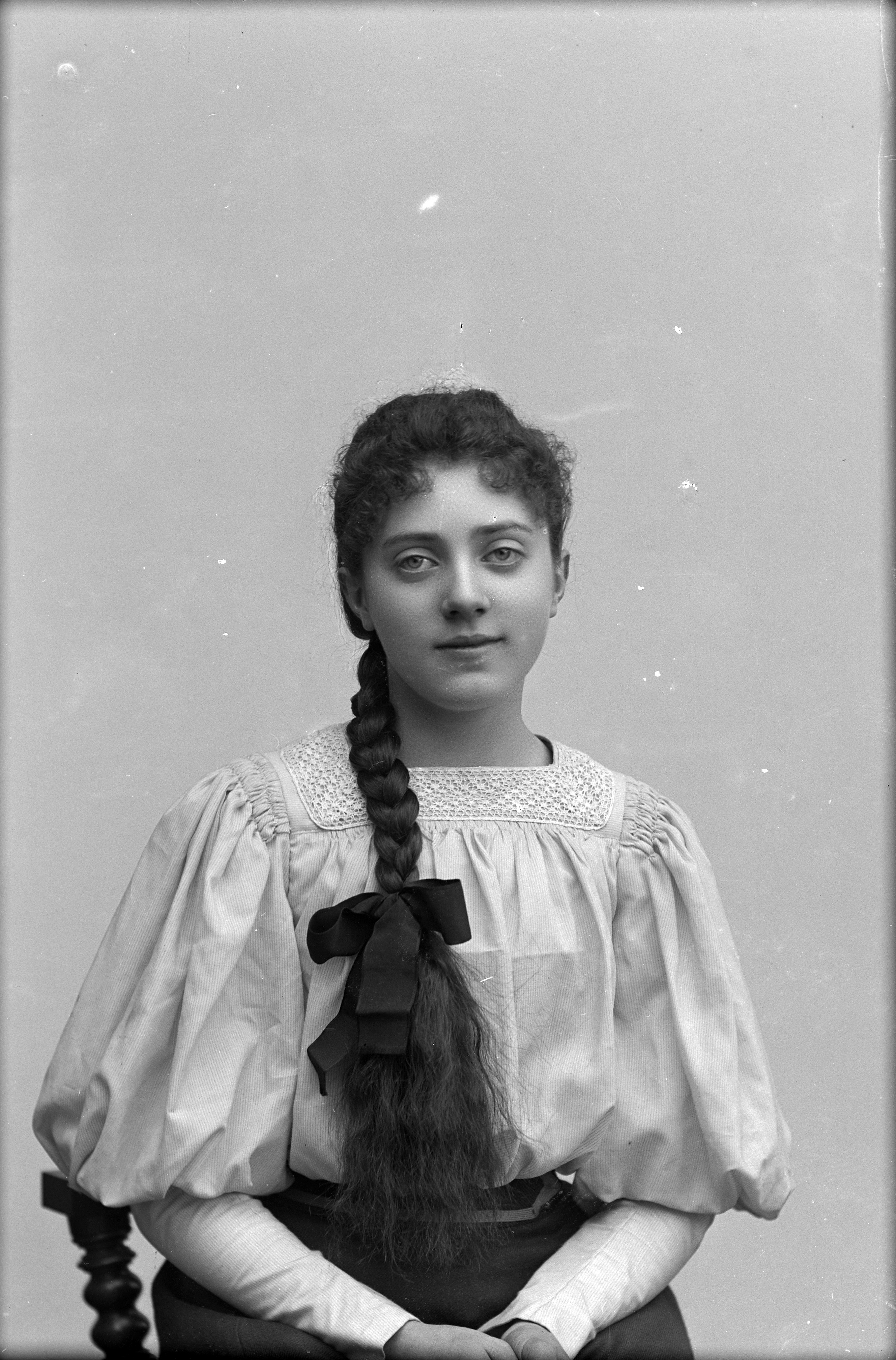 Beskrivning: Porträtt i halvfigur av fröken Brunner med bred hårfläta och rosett.