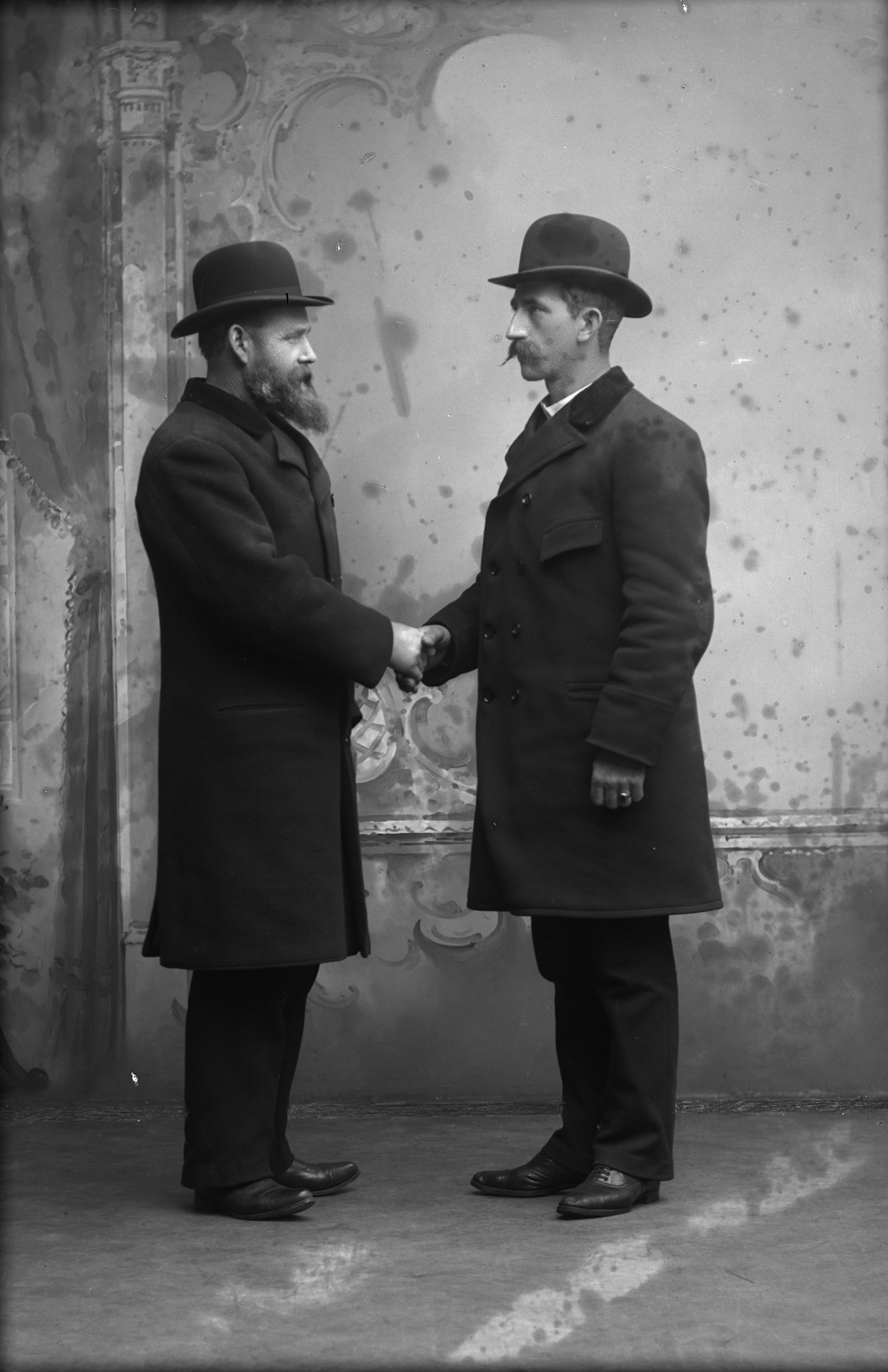 Porträtt i helfigur av herr Ekerholm med okänd man, iklädda hattar och ytterockar, skakande hand. Fotograferade framför ateljéfond.