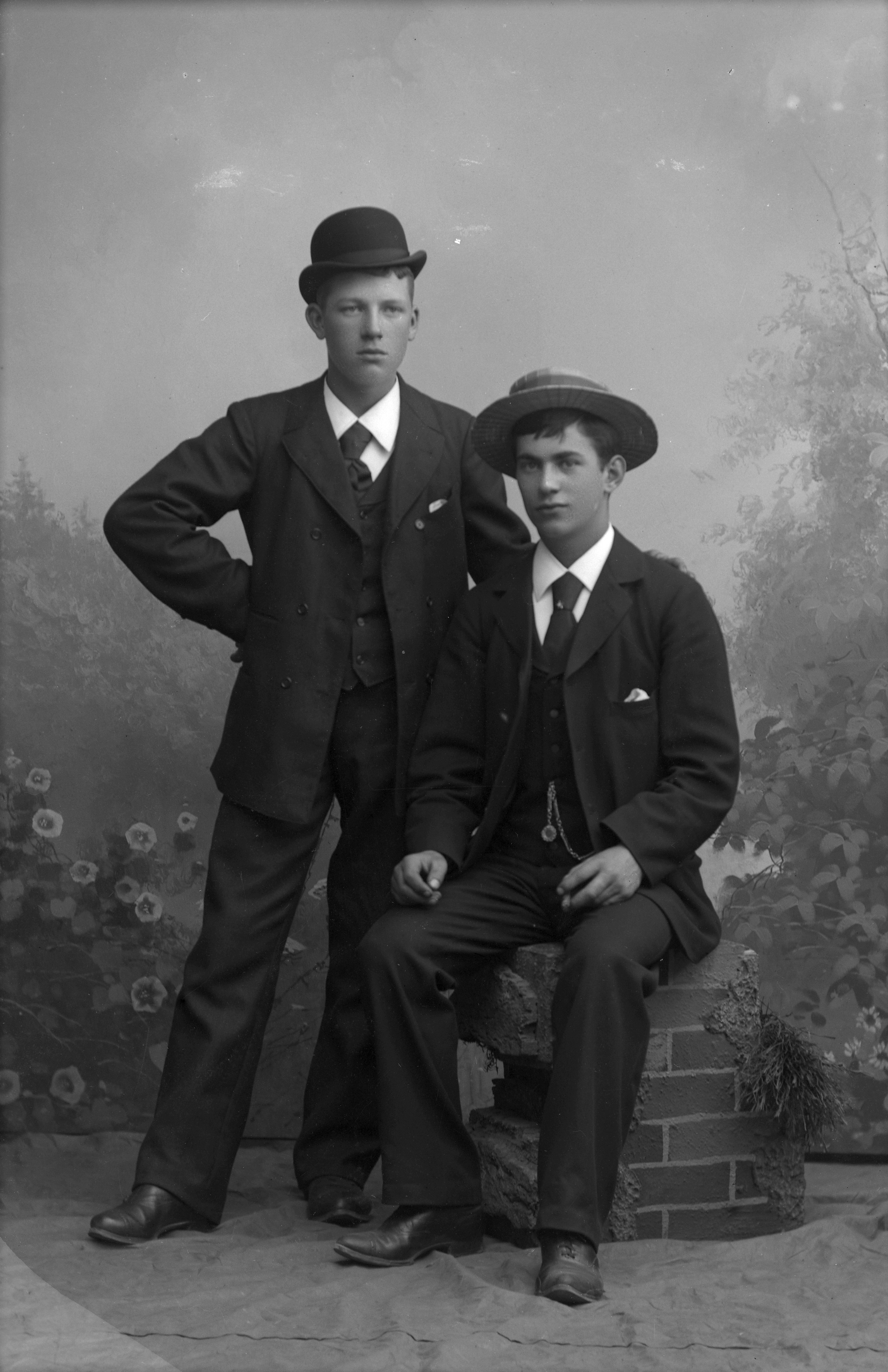 Porträtt i helfigur av typograf Axel Frick och Gustaf Lindskog, iklädda hattar. Lindskog sittande på tegelmur. Fotograferade framför ateljéfond.