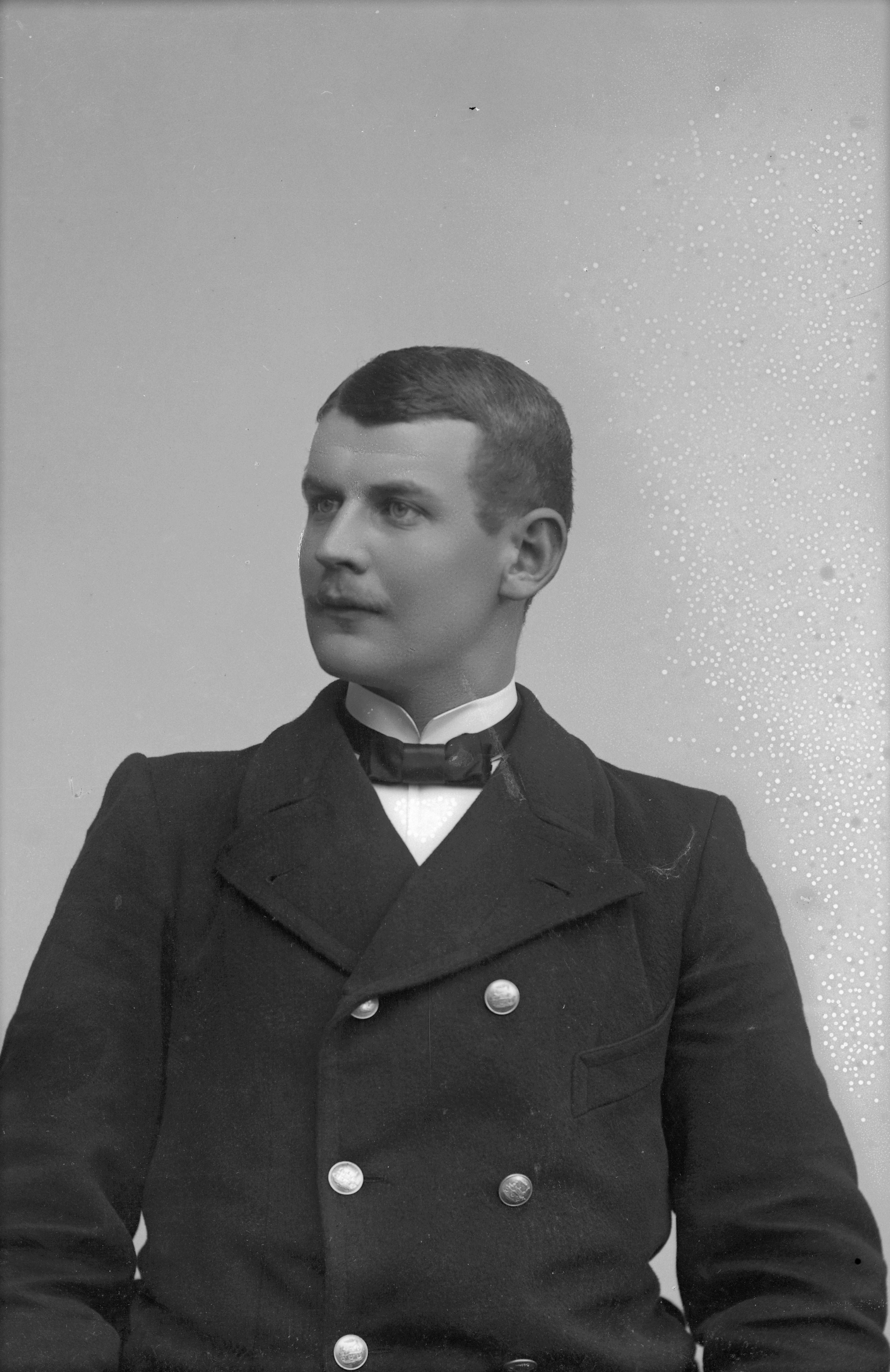 Porträtt i halvfigur av stationskarl Sven Jönsson Sjöbeck, iklädd SJ-uniform.