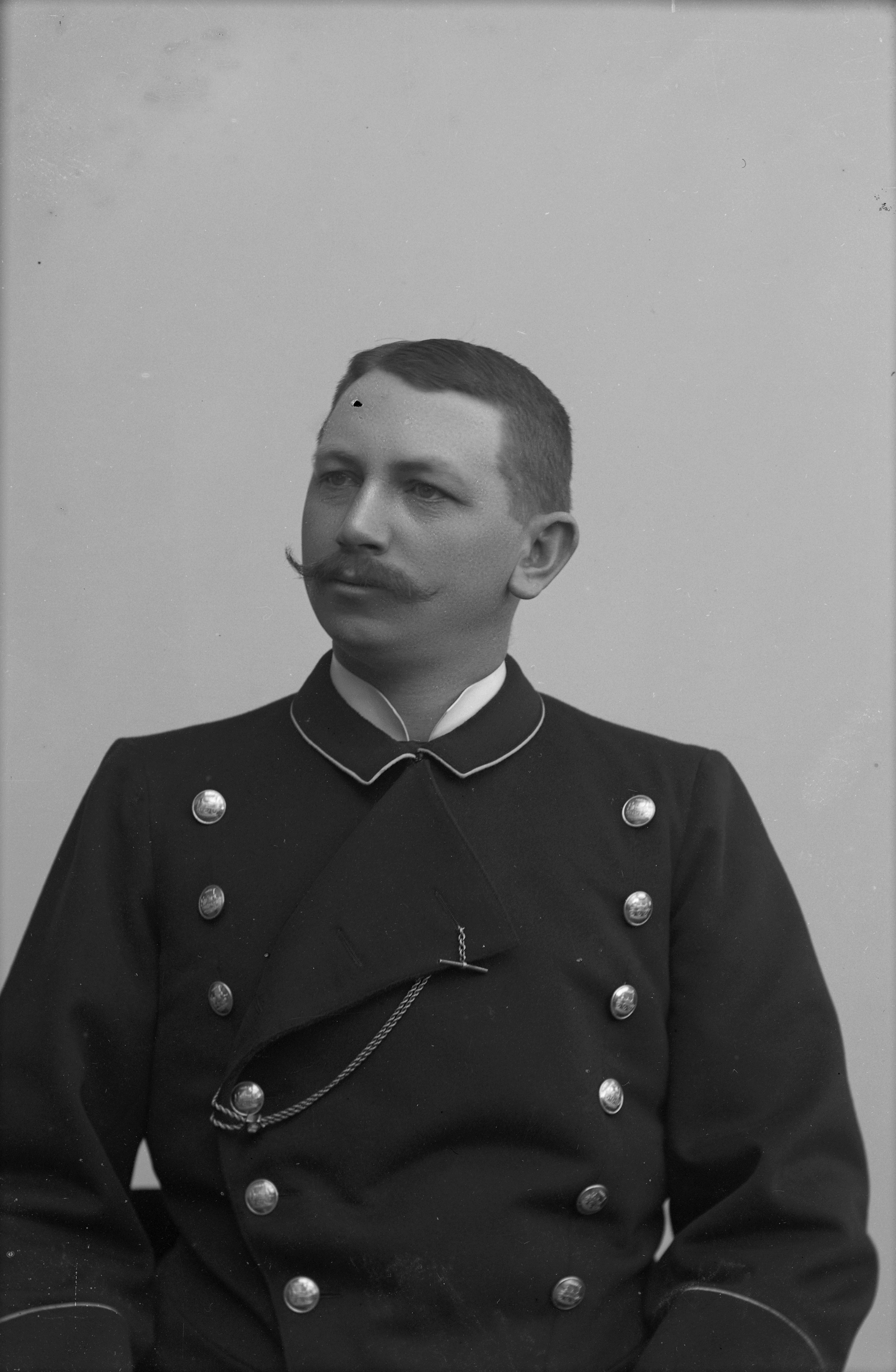 Porträtt i halvfigur av konduktör Karl Edvard Rundqvist, iklädd SJ-uniform.