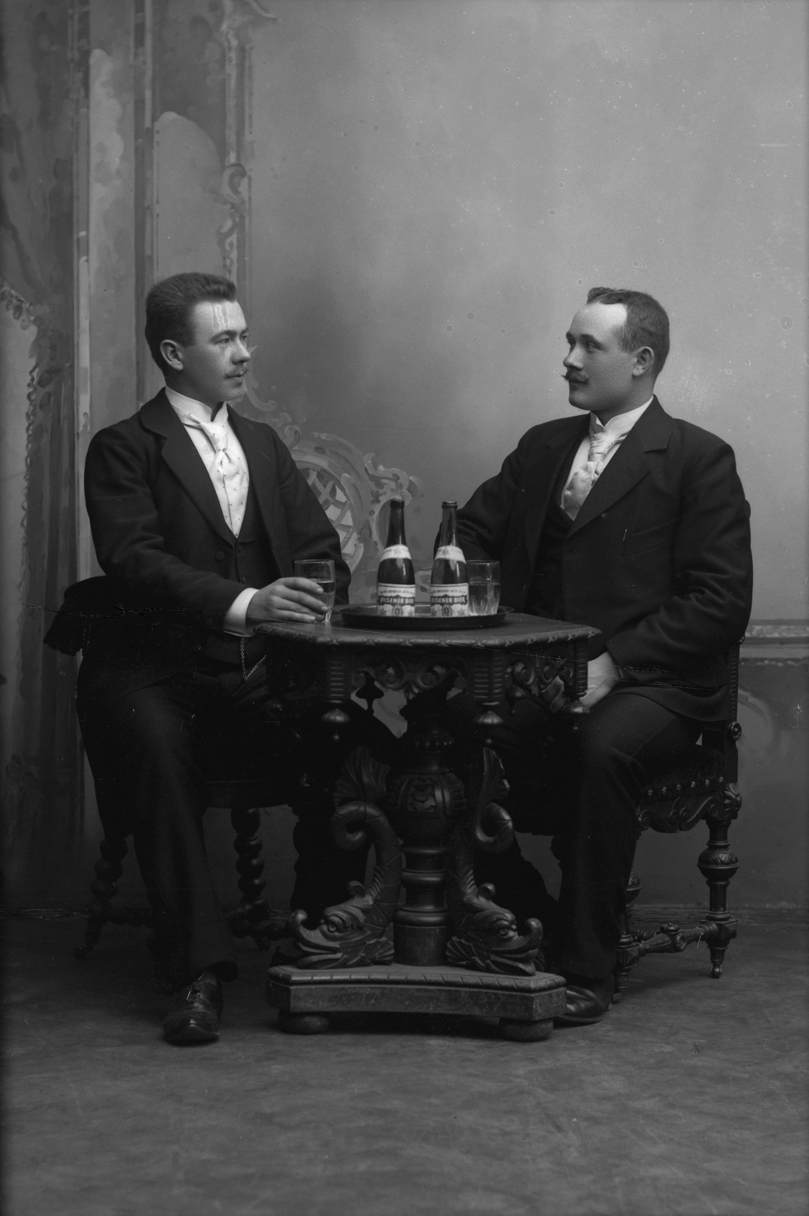 Porträtt i helfigur av N. Stjernfeldt med okänd man, sittande vid bord med flaskor, hållande glas.