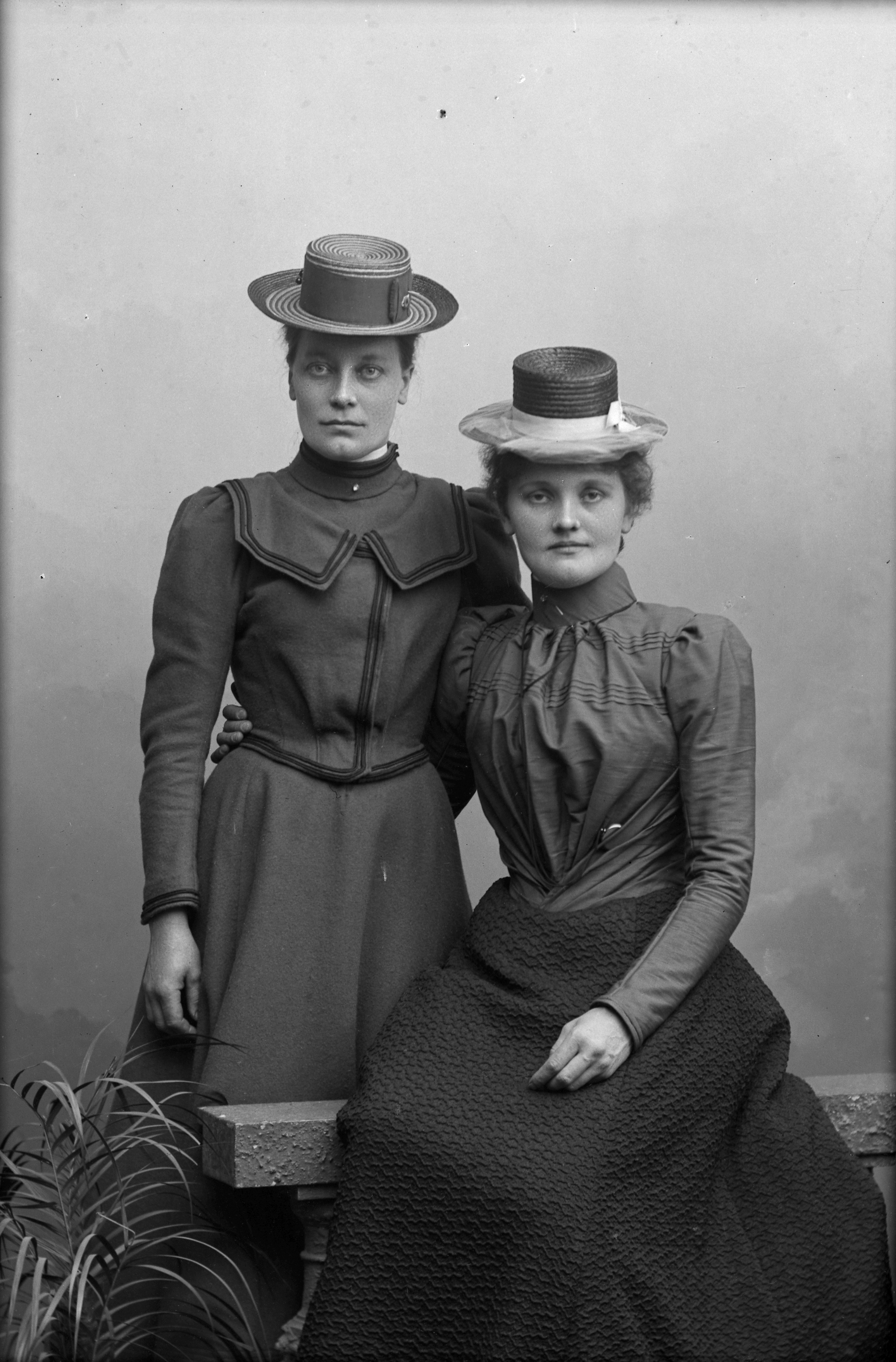 Porträtt i helfigur av Anna Johansson med okänd kvinna, iklädda hattar.