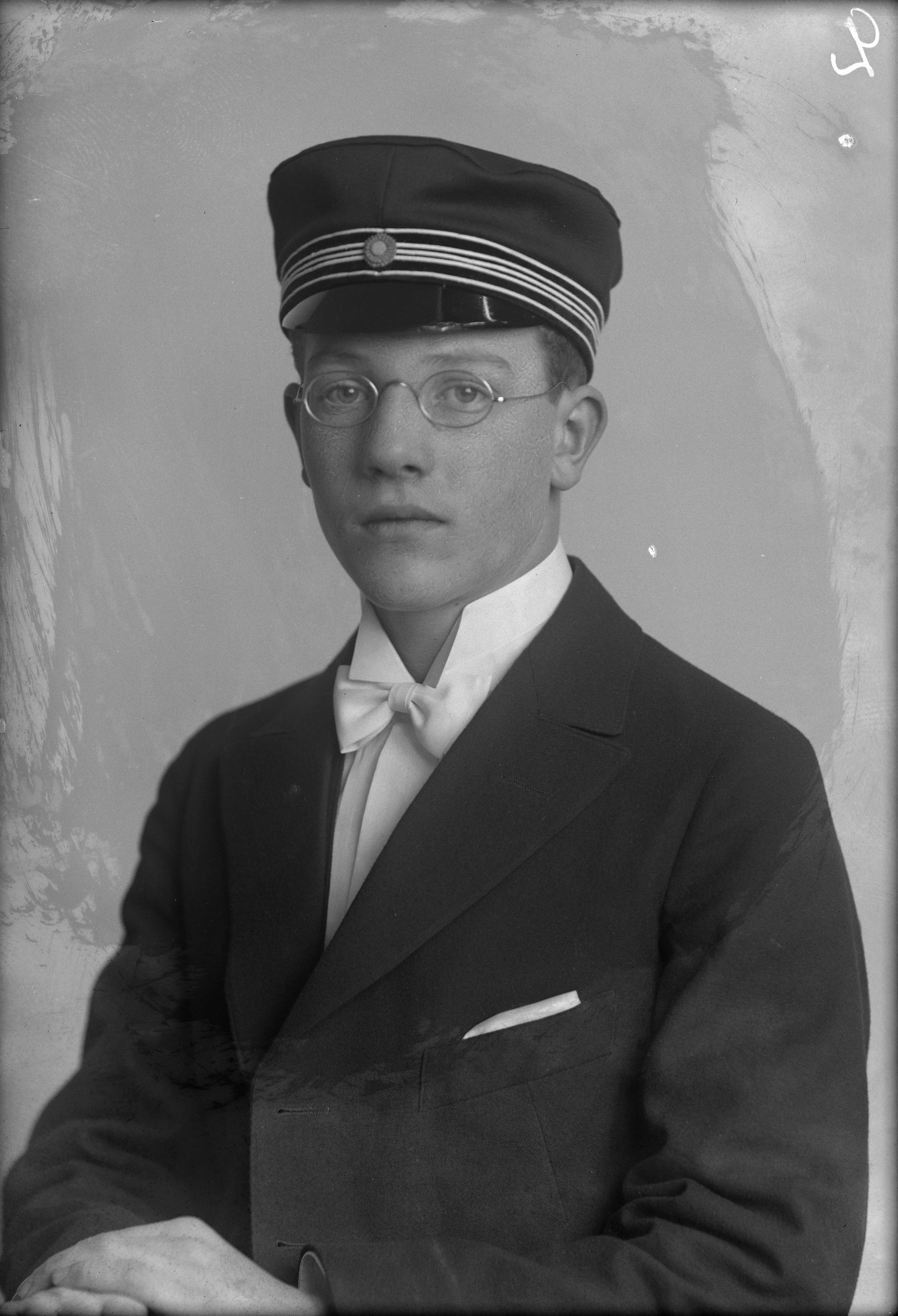 Porträtt i halvfigur av konfirmanden Jean Nilsson, iklädd skärmmössa.