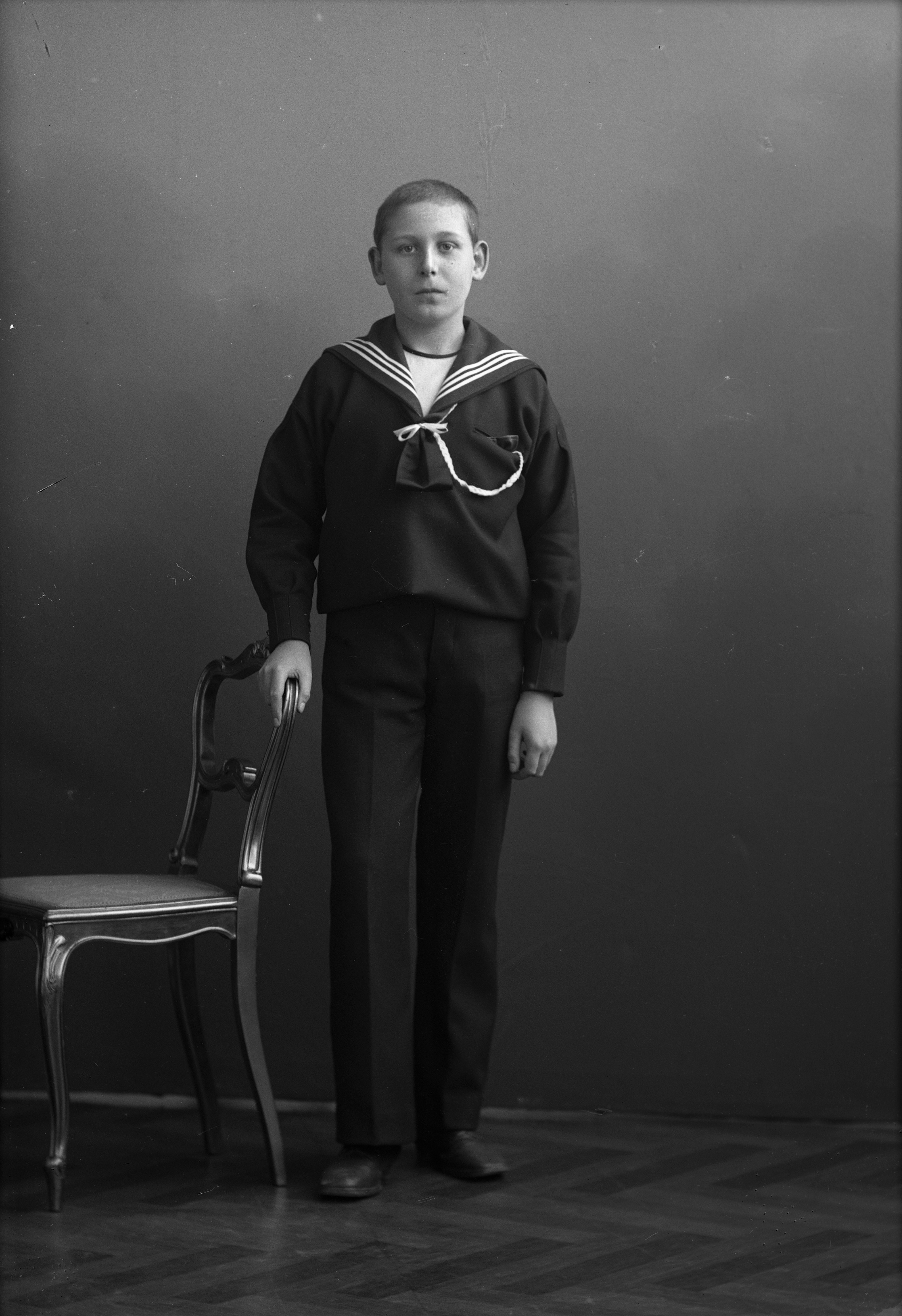 Porträtt i helfigur av Gunnar Ljungbeck, iklädd sjömanskostym, stående vid bord (i nyrokoko).