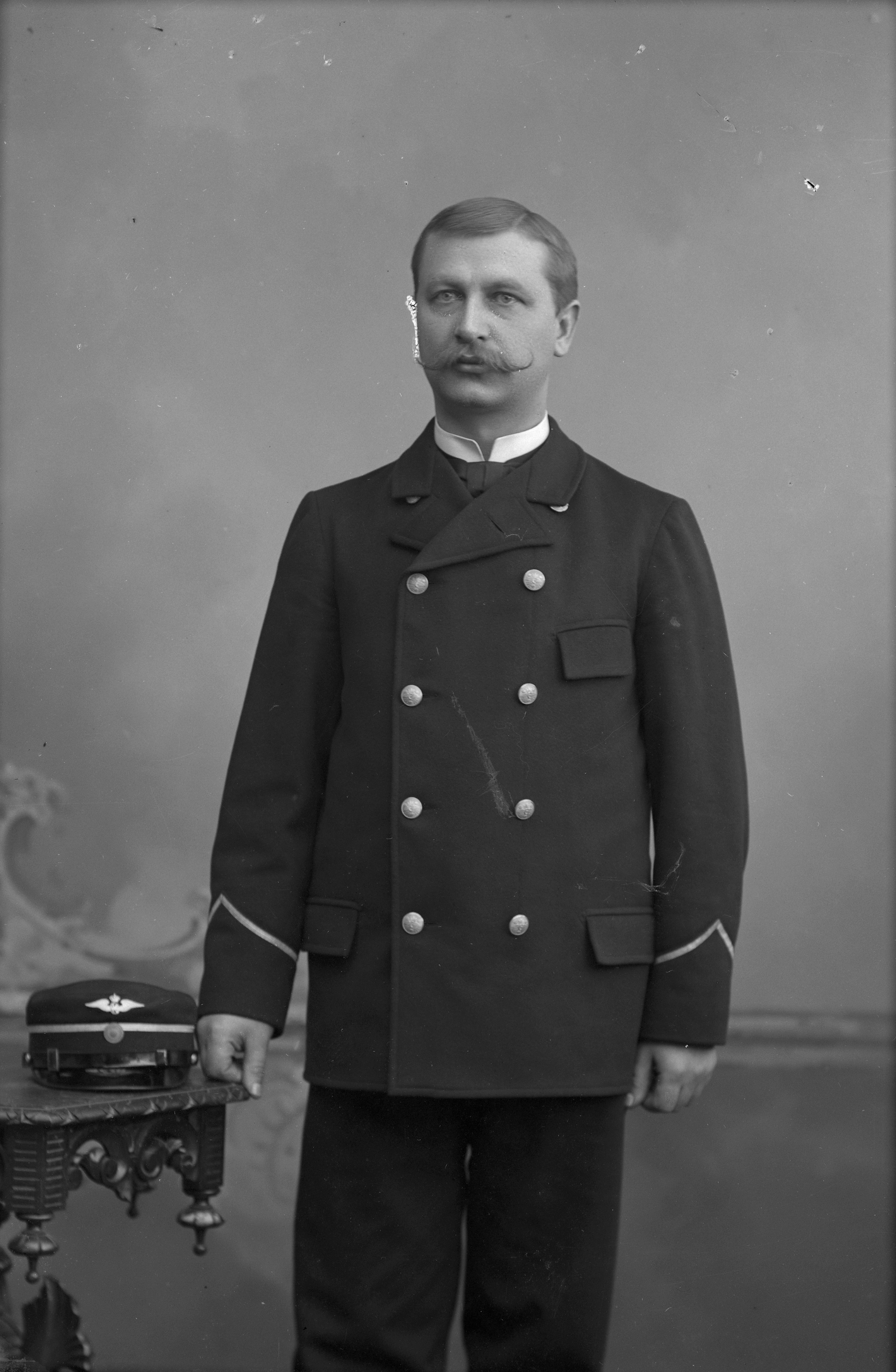 Porträtt i helfigur av stationskarl N. Bengtsson, iklädd SJ-uniform, stående vid bord. På bordet ligger hans mössa med emblem.