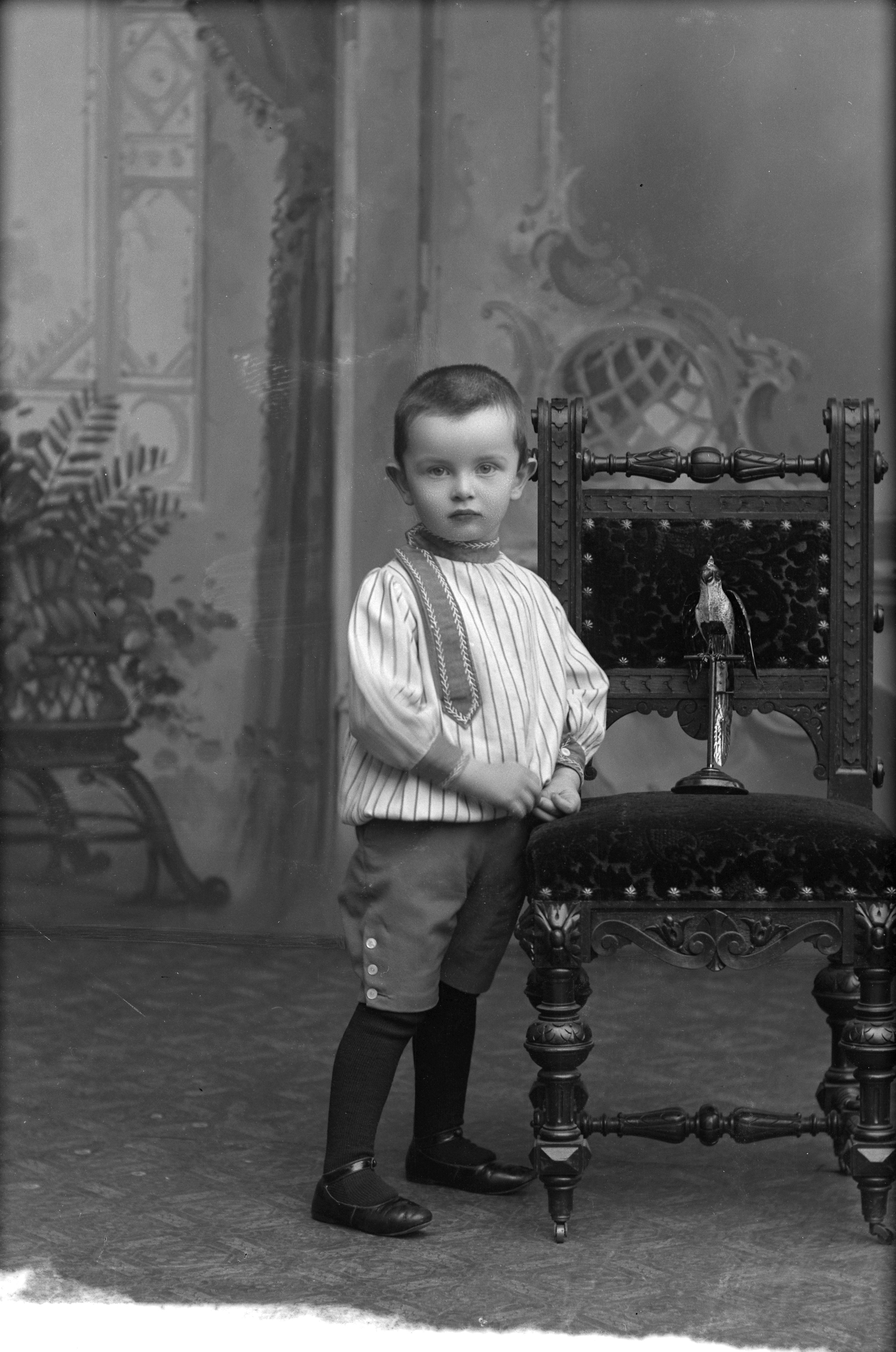 Porträtt i helfigur av Reinhold von Essens son, stående vid stol. På stolen står en statyett med fågel. Fotograferad framför ateljéfond.
