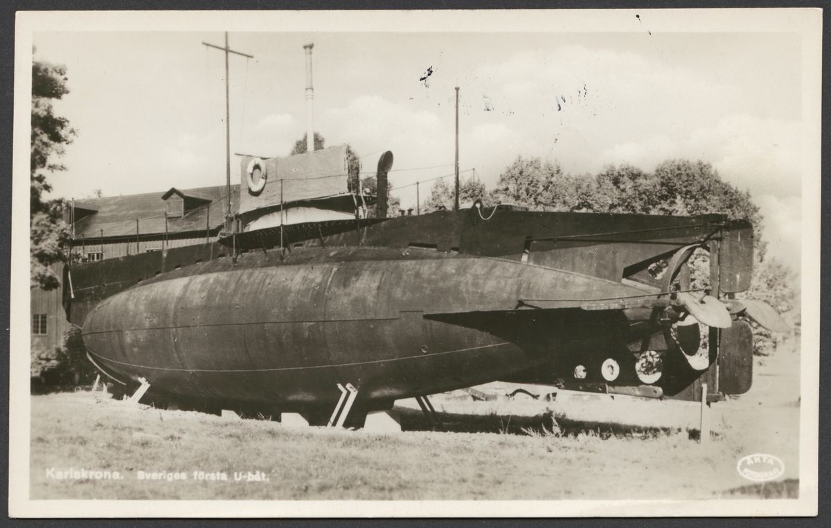 Titel: Bilden visar Sveriges första ubåt på sin gamla uppställningsplats på Lindholmen på Karlskronavarvet.