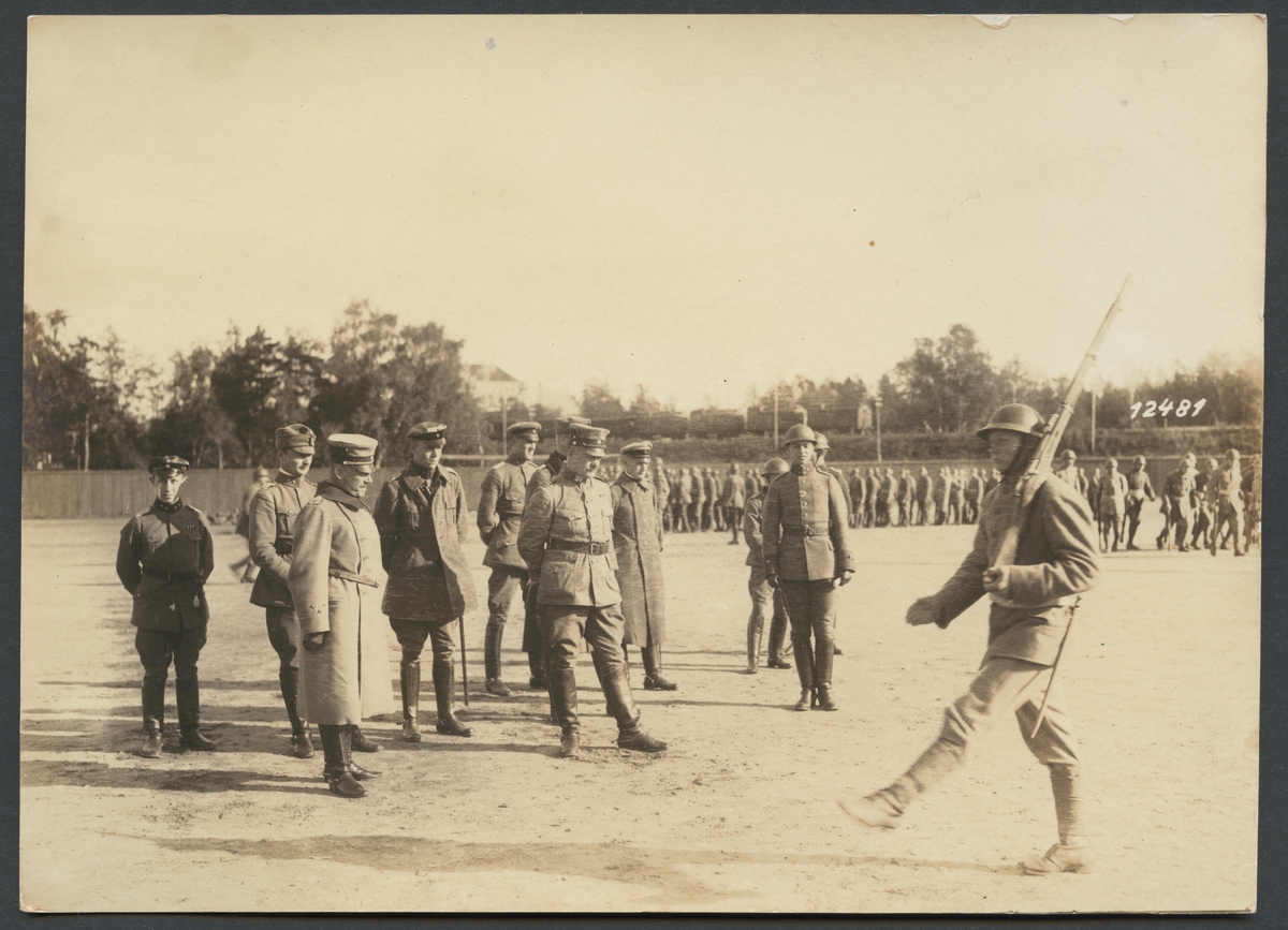 Titel: Bilden visar en soldat med gevär på axeln som marscherar förbi en grupp officerare.