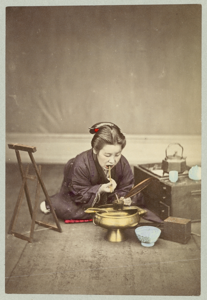Bilden visar en japansk kvinna som svärta sina tänder. Tekniken kallas för Ohaguro och är en symbol för trogenhet. Sceneriet är arrangerat för fotografering i en ateljé.