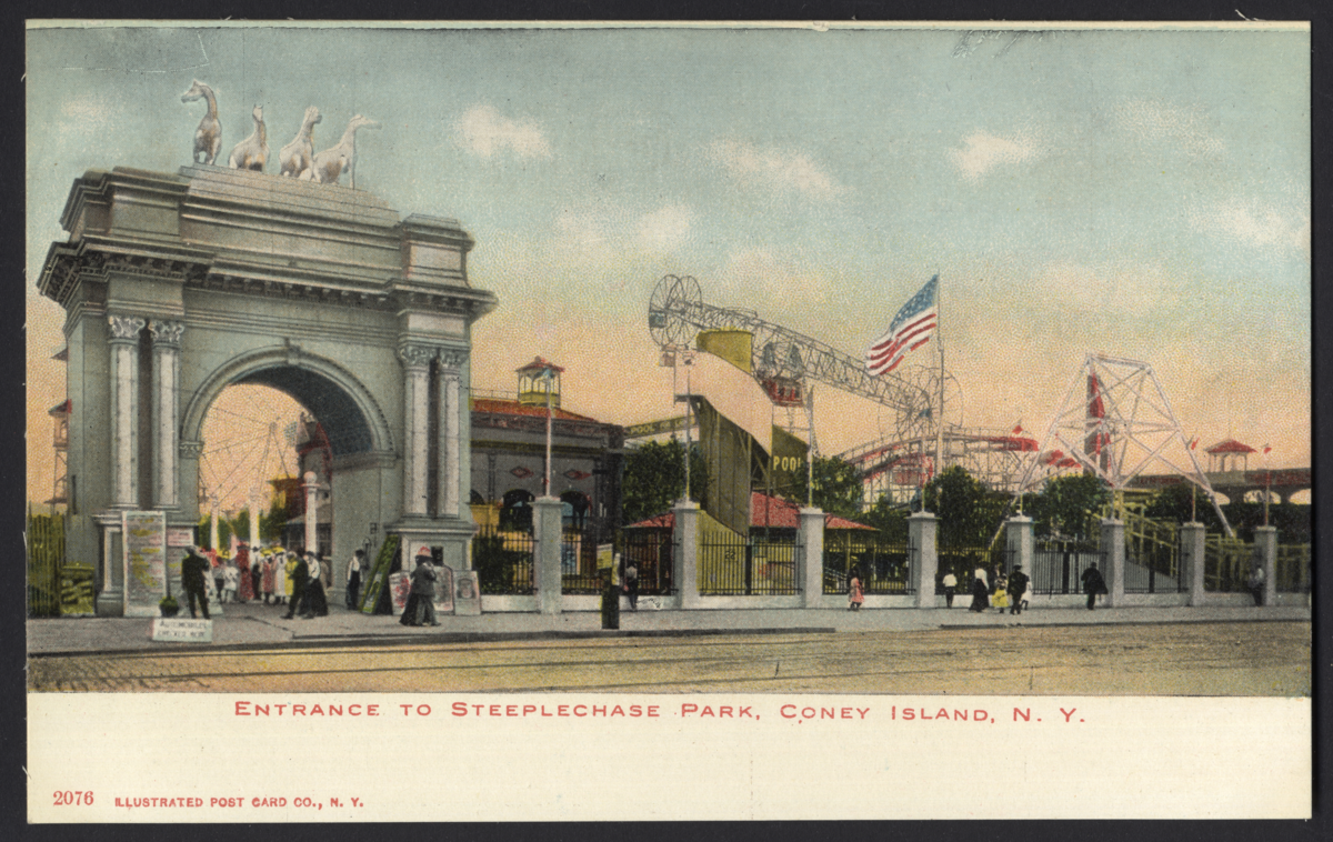 Vykorten visar ingången till Steeplechase park på Coney Island, New York.