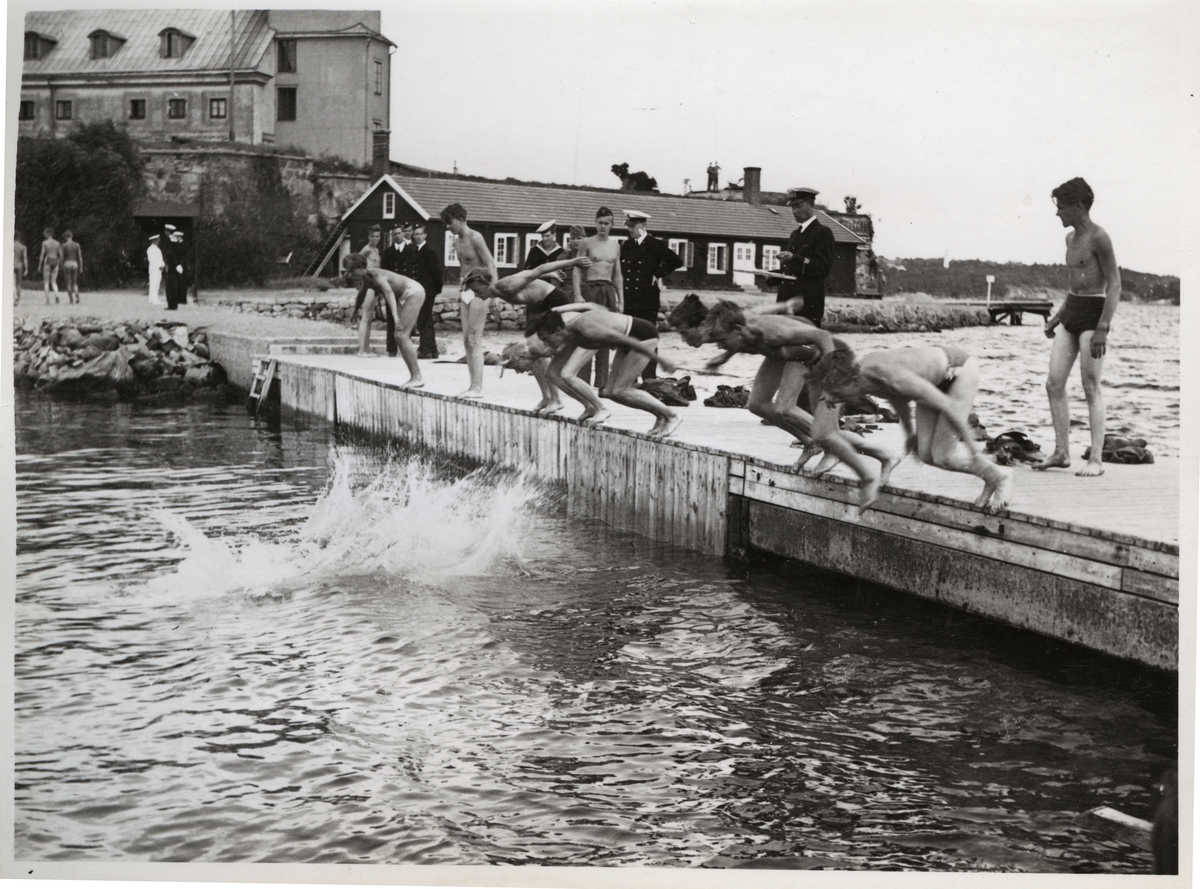 Bilden visar en grupp värnpliktiga under simutbildning som håller på att hoppa i havet från en brygga. Flera officerare övervaka och anteckna skendet. I bakgrunden syns Kungshall fästning på Stumholmen i Karlskrona.