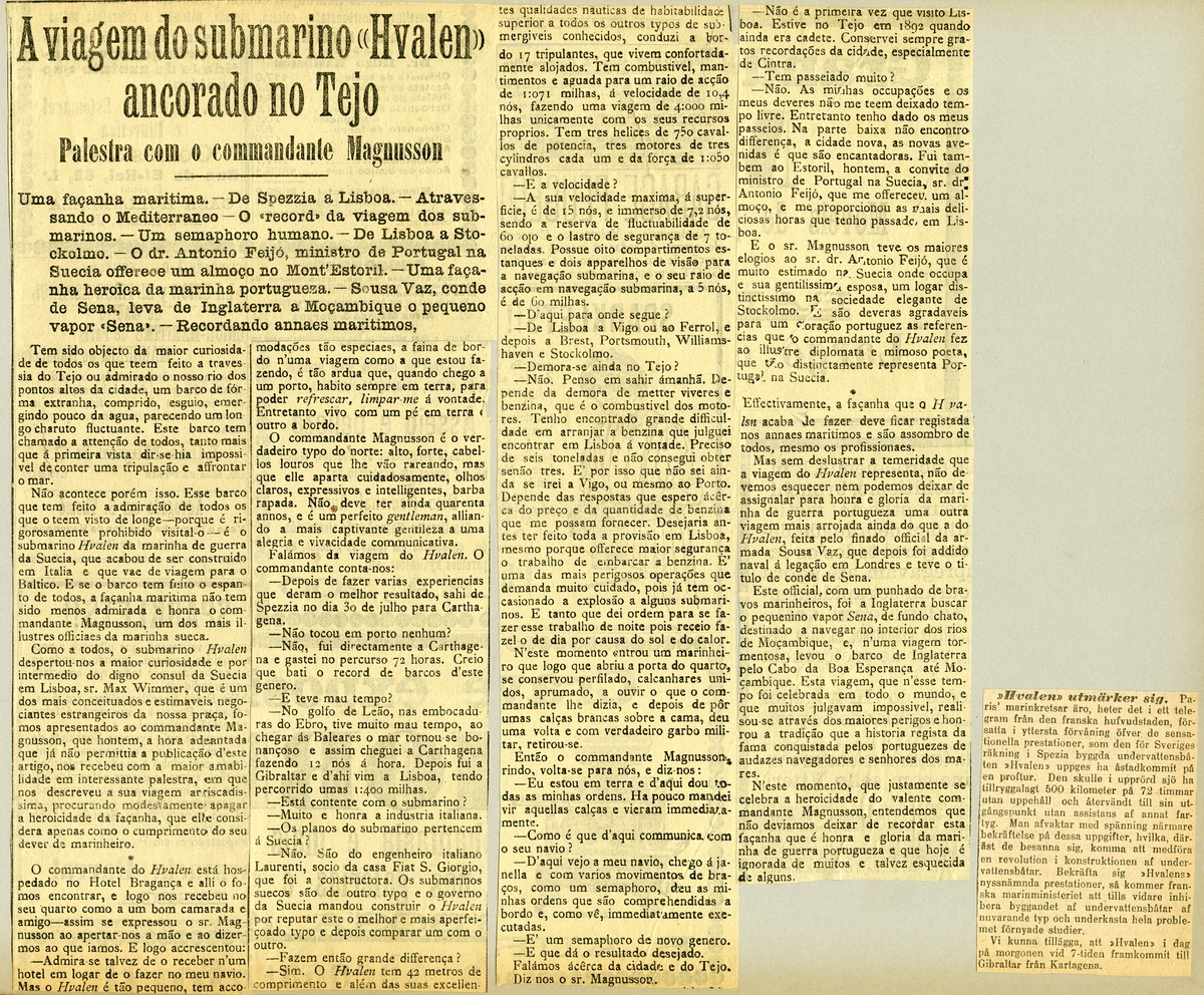 Titel: Tidningsurklipp om ubåten HVALEN. Intervju med kapten Magnusson i en portugisisk tidning.