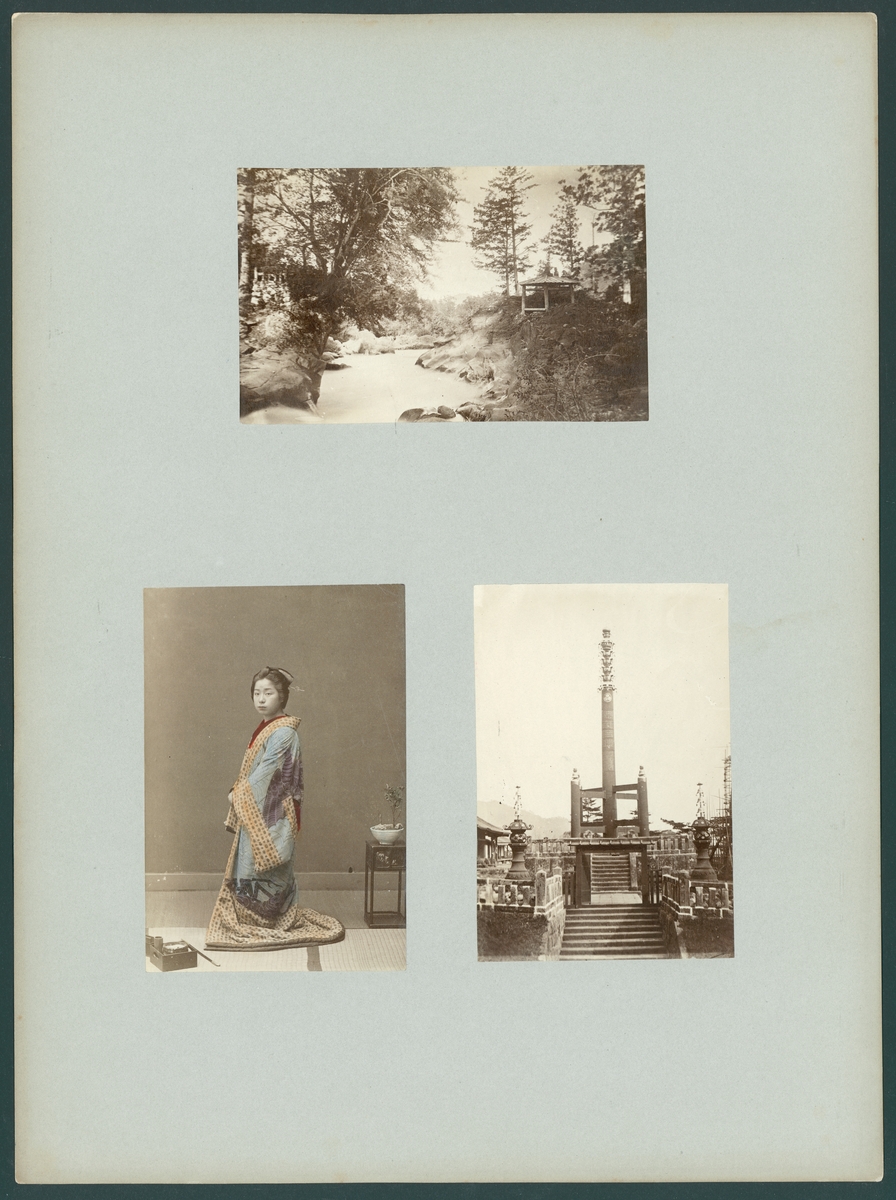 Bildserie av tre motiv monterad på kartong med landskap, tempelarkitektur och porträtt från staden Nikko i Japan.
