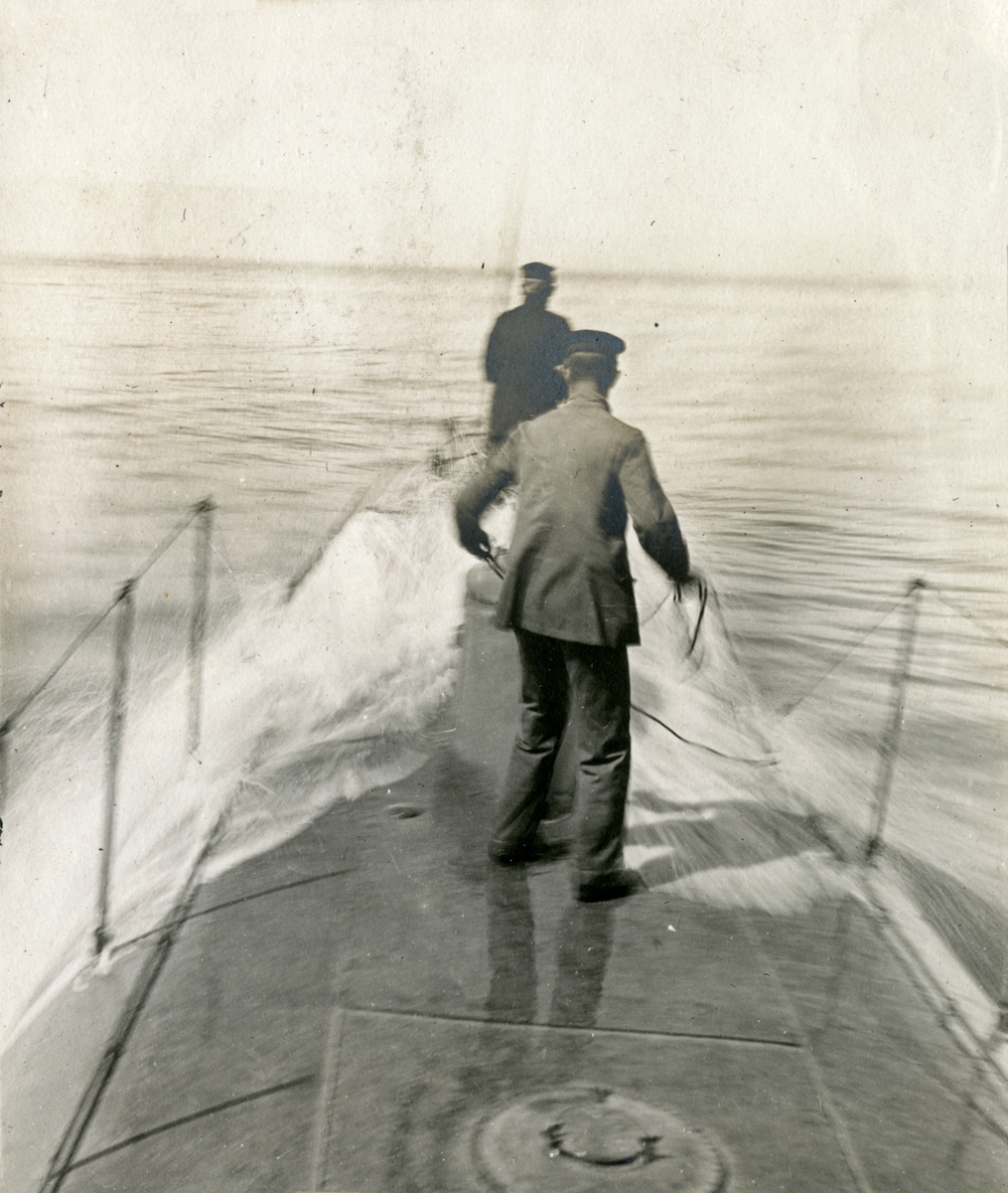 Titel: Överspolning av backen. Två besättningsmän ombord ubåten HVALEN.