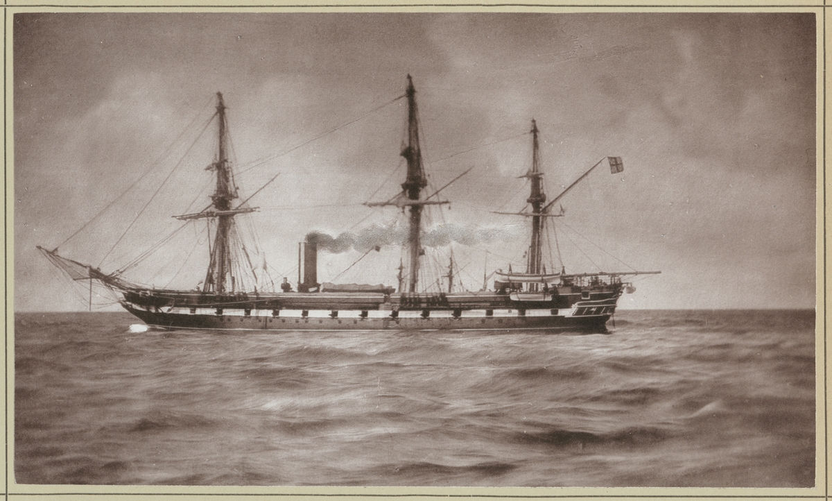 Bilden visar den tyska fregatten SMS Hertha till havs. På grund av motvind gå den på ångmaskin.