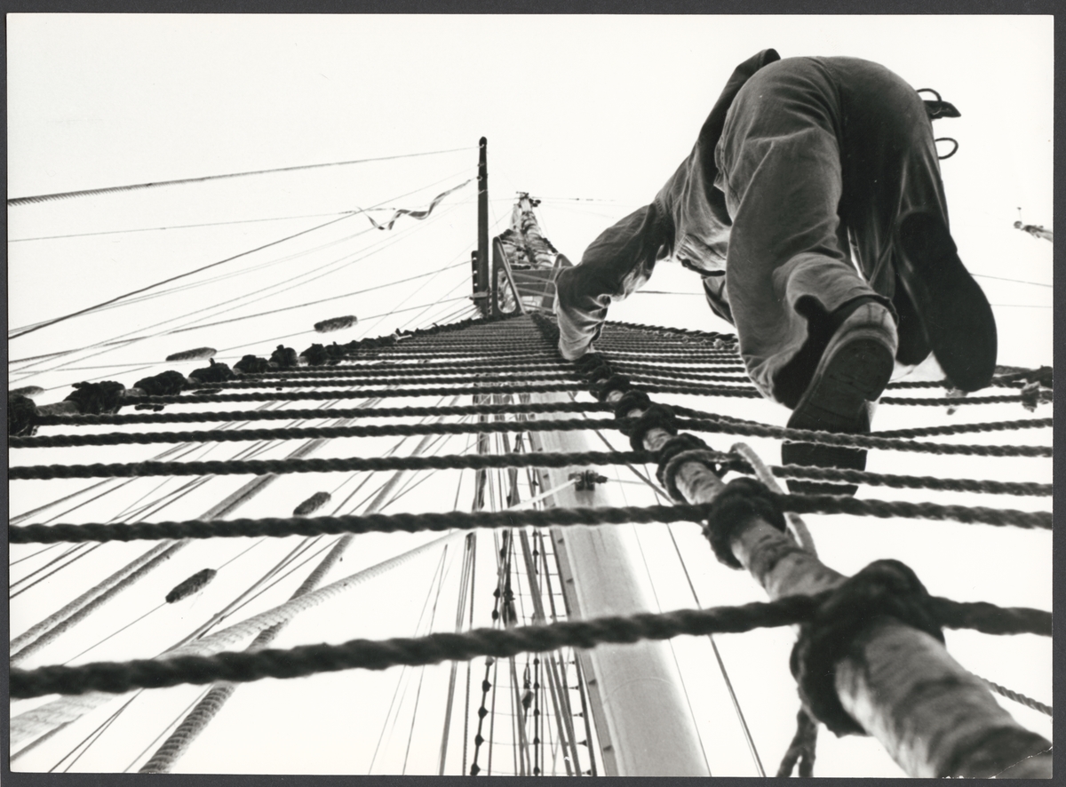 Bilden visar en kadett som klättra upp i en vant på en av flottans skolfartyg Gladan eller Falken. Fotot är tagen underifrån ur grodperspektiv