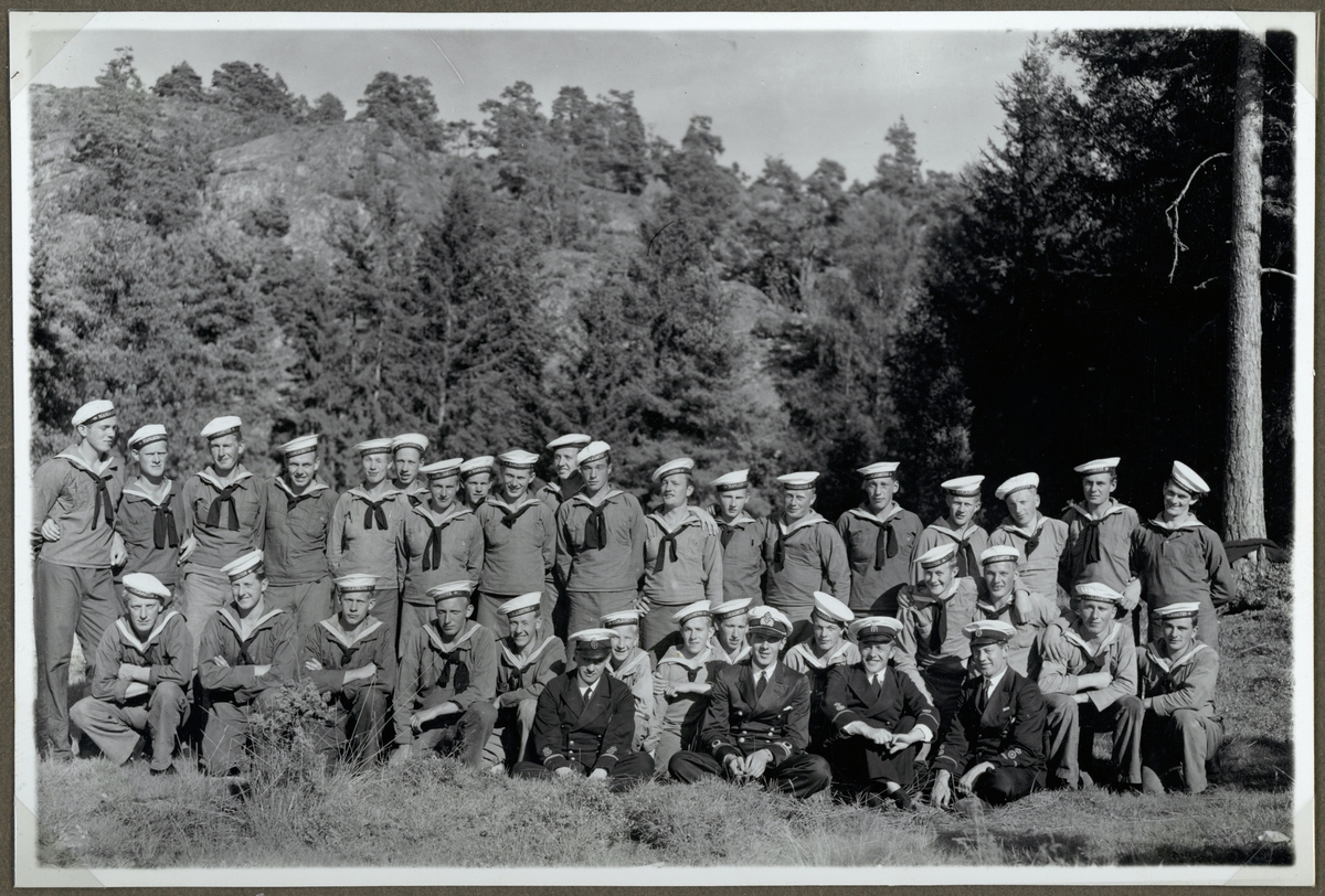 Titel: Manskap och befäl från pansarskeppet Manligheten har samlats för en gruppfoto.
