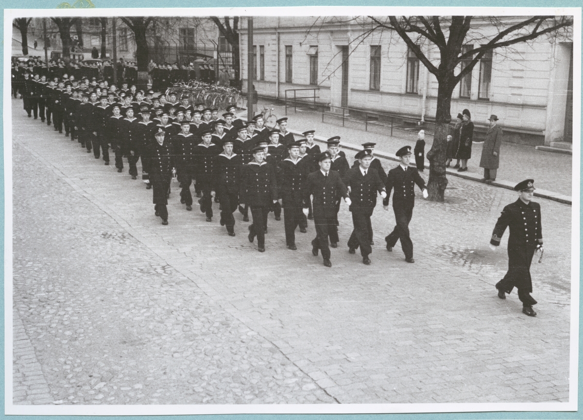 Uniformsklädda flottister marscherar längs med Drottninggatan under ledning av en kapten. Den stenlagda gatan kantas av bataljon Sparres kanslibyggnad. På gatan står även ett par civila åskådare.