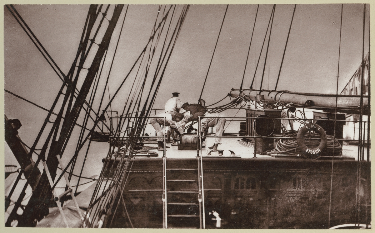 Bilden visar mätningen av hastigheten på segelfartyget Stosch med hjälp av en logglina. Det syns hur fem besättningsmän hämtar in linan.