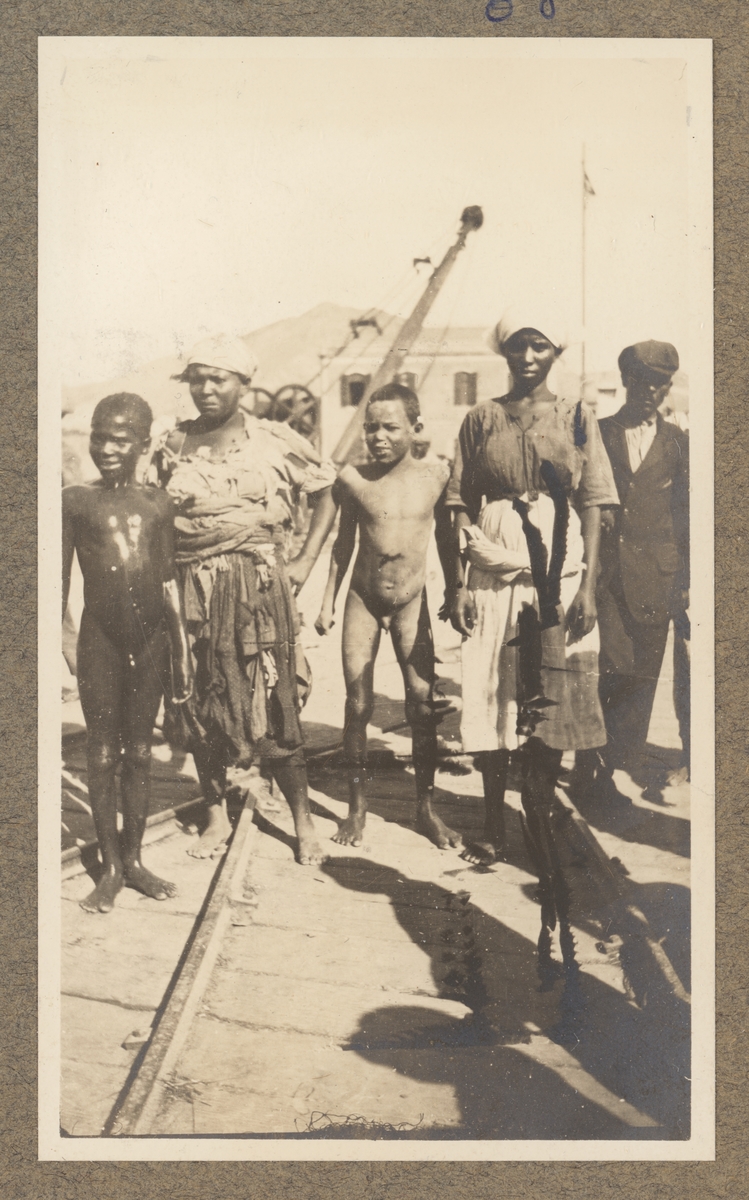 Bilden visar två svarta kvinnor, två nakna pojkar och en svart man i en hamnmiljö. I förgrunden syns en järnvägsräls och i bakgrunden en lyftkran.