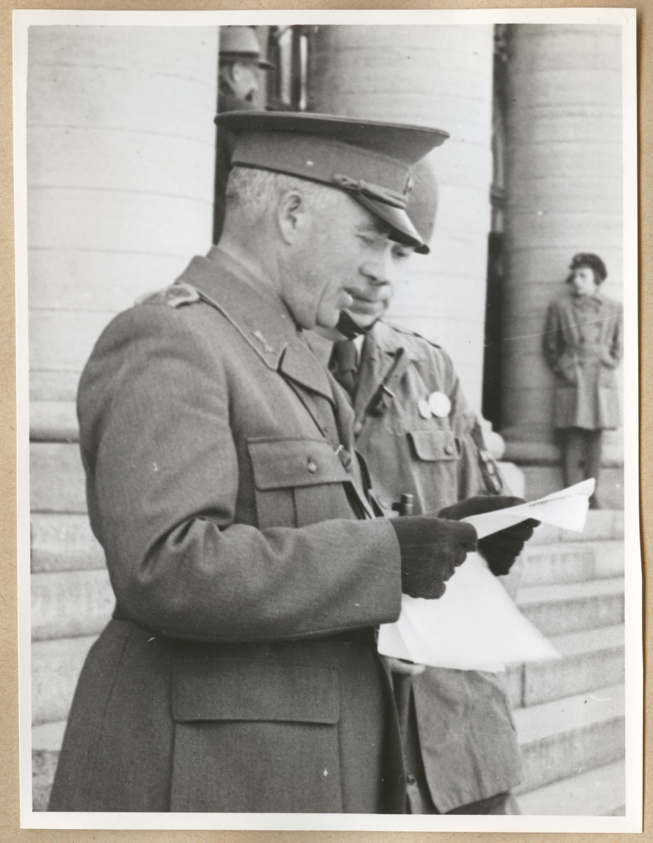 En militär och en hemvärnssoldat, båda klädda i uniform, står vid rådhusets trappa och samtalar medan de tittar på ett papper som militären håller i händerna. I bakgrunden syns två civila personer, en man och en flicka, som står vid rådhustrappans kolonner.
