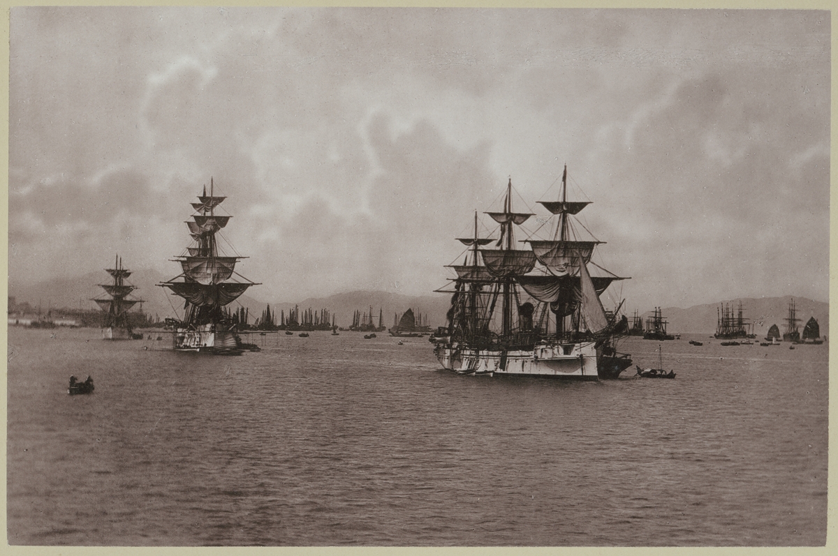 Bilden visar en fransk eskader i hamnen av Xiamen, tidigare Amoy. Pansarfregatterna har släppt ut seglarna för torkning.