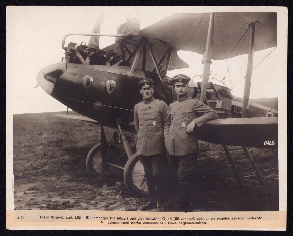Bilden visar två piloter som poserar framför sin flygplan i vanlig uniform med utmärkelser. Enligt bildtexten är de löjtnant Eisenmenger och vice fältväbel Gmund.