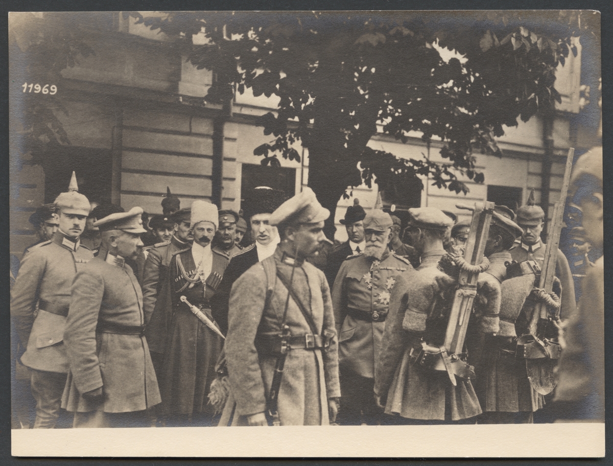 Bilden visar det ukrainskt statsöverhuvud general Pawlo Skoropadskyj och den tyske general von Kirchbach som inspekterar soldater.