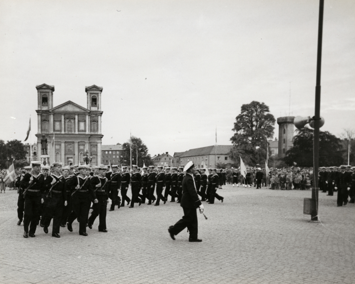 Flottans militärer marchera i kolonn på stortorget. Sjöbefälet tar täten. I bakgrunden syns Fredrikskyrkan samt vattentornet.