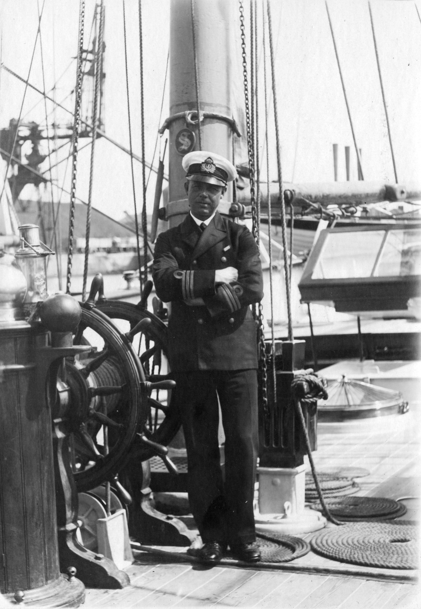 Titel: Fartygsbefäl står med armarna i kors ombord på Jarramas i Malmö 1924.