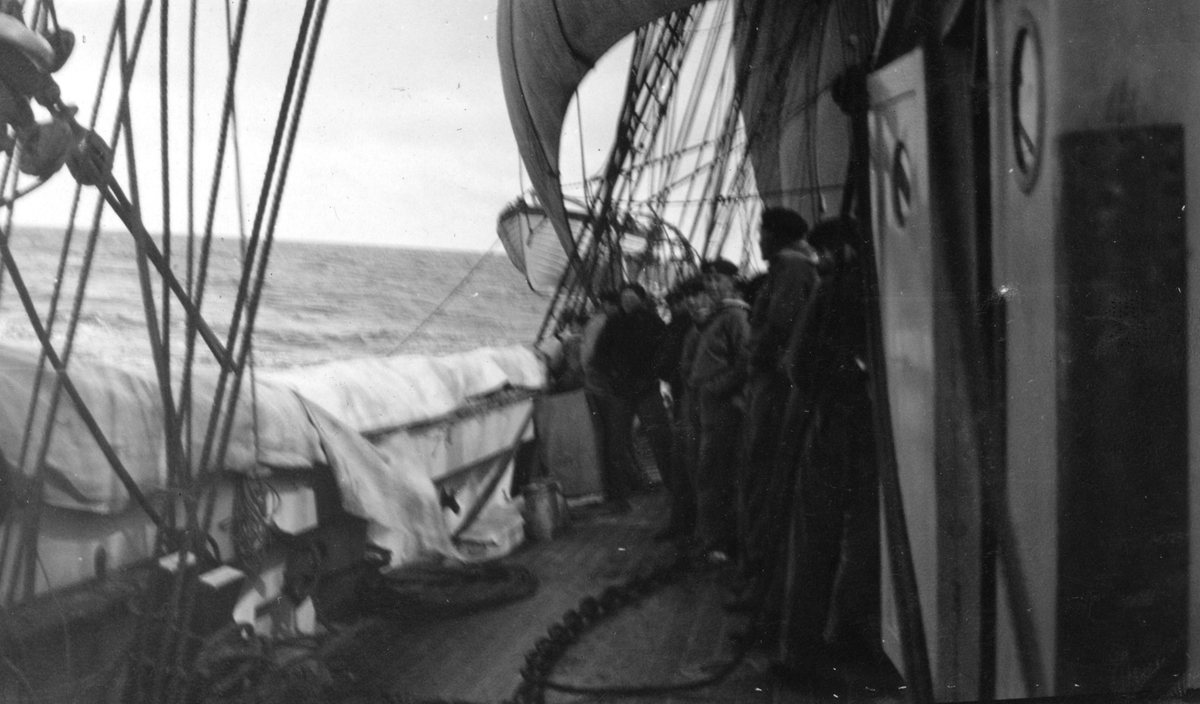 Titel: Sjömän står på Jarramas däck med händerna i fickorna och blickar ut mot havet.