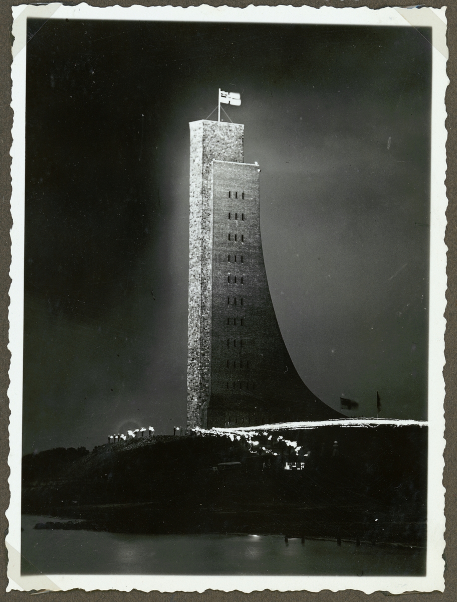 Bilden visar den marina minnesmärken i Kiel/Laboe på natten. Det pågår en ceremonie som kallas för "Fackelzug" en tåg med facklor i mörkret runt byggnaden.