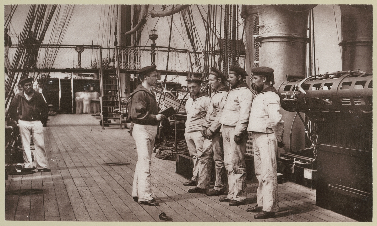Bilden förställer tyska sjömän ombord på korvetten Stosch som får ett straff för att har varit ouppmärksam i undervisningen.