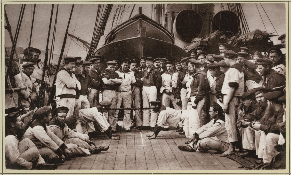 Bilden visar manskapet ombord på korvetten Stosch som njuter av fritiden med en lek som heter "Stroppspiel". Spelet är en dragkamp med ett speciellt stycke tågvirke som heter "Stropp" där spelarna står på knä med stropp runt nacken och måste dra varandra över en markering.
