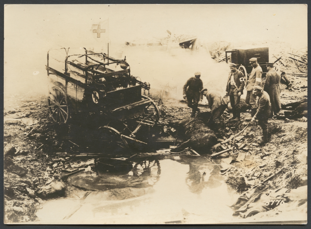 Bilden visar hur en grupp soldater plocka upp efter ett anfall på en fältlasarett. Det syns en sönderskjuten hästvagn med döda hästar som ligger i ett vattenfyllt granathål.