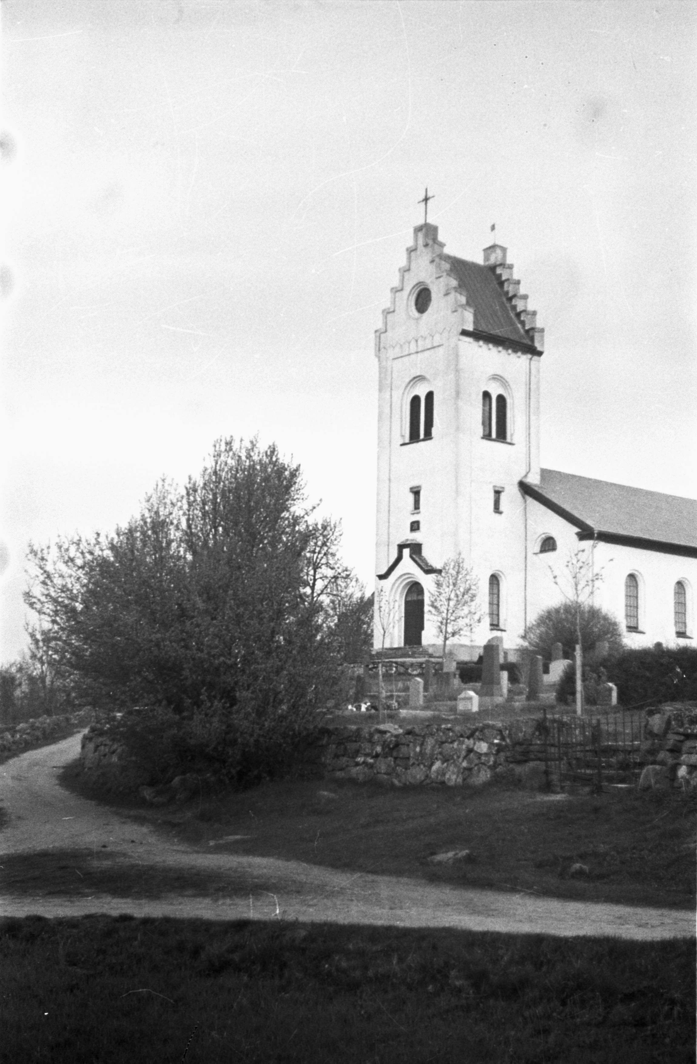 Kyrkan från sydväst. Gråstenskyrka uppförd 1874 (snabbinv), med trapptorn. Ritad av arkitekten Albert Teodor Gellerstedt.