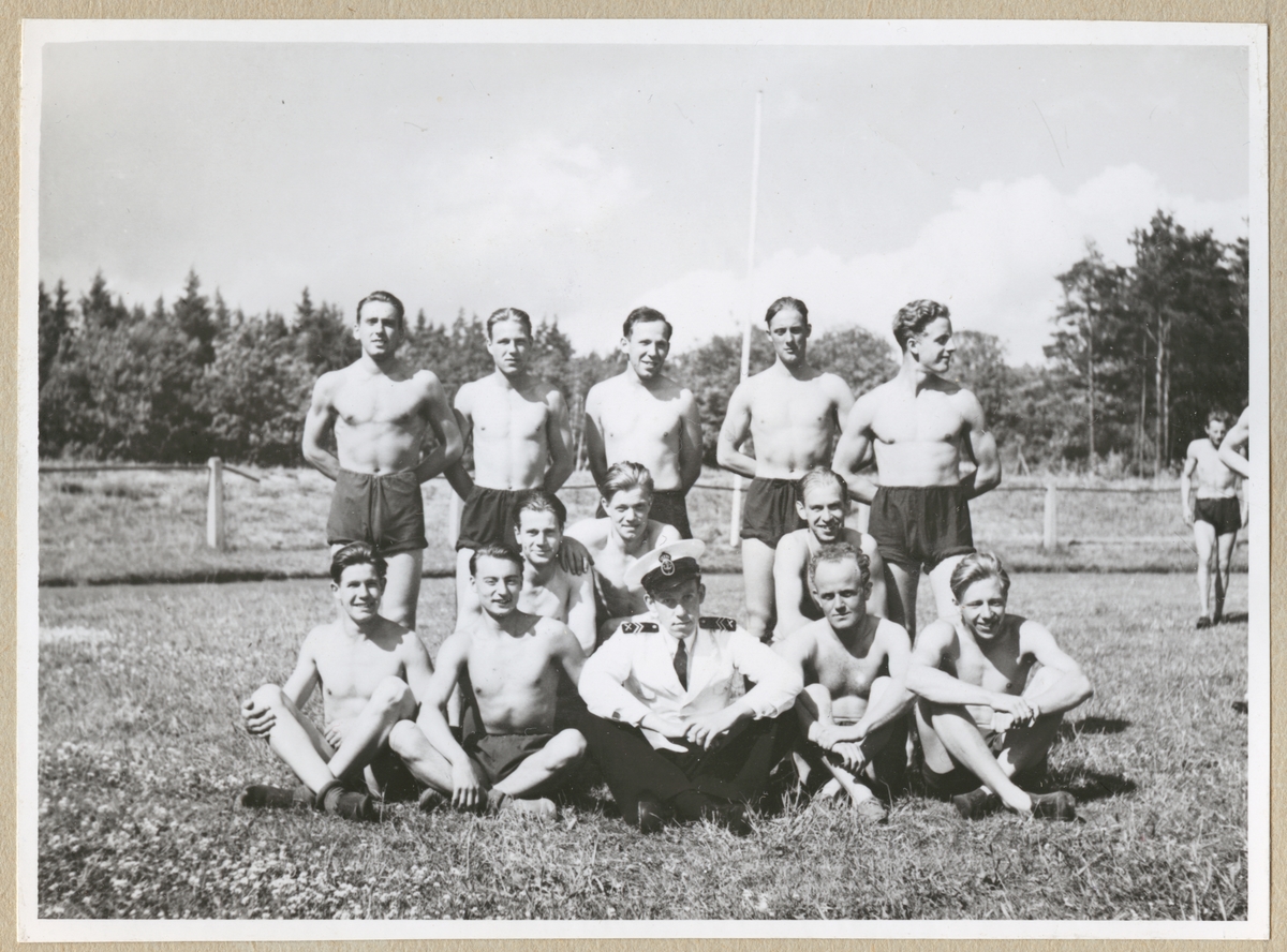 Barbröstade unga män, iförda shorts, har samlats på en gräsyta för att ta en gruppbild. Den främre raden sitter ned på marken medan den mittersta raden sitter på huk och den bakre raden står upp. I mitten i den främre raden sitter en uniformsklädd militär.