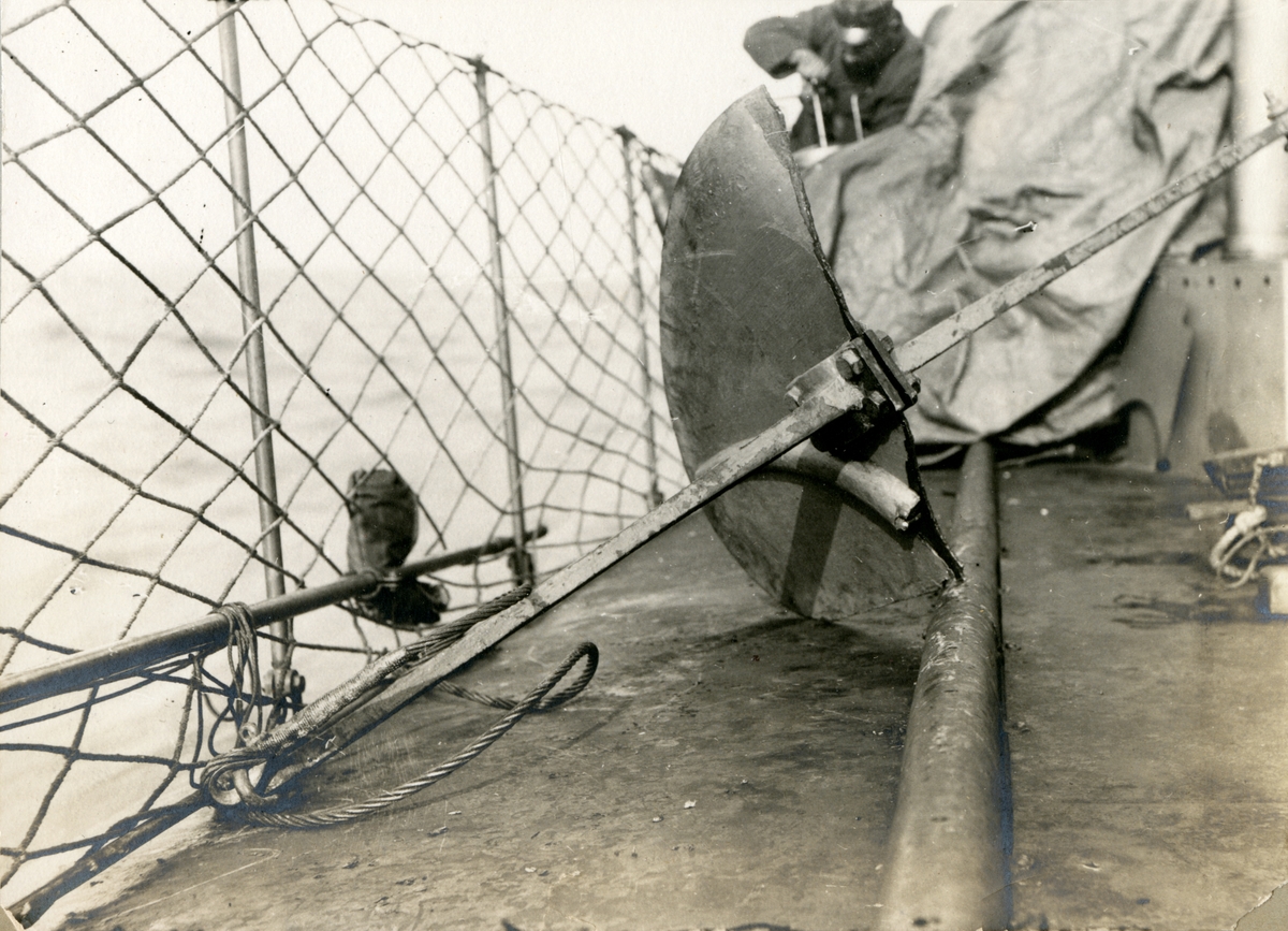 Titel: Nödriggningsarbete av trasigt roder pågår ombord ubåten HVALEN utanför holländska kusten.