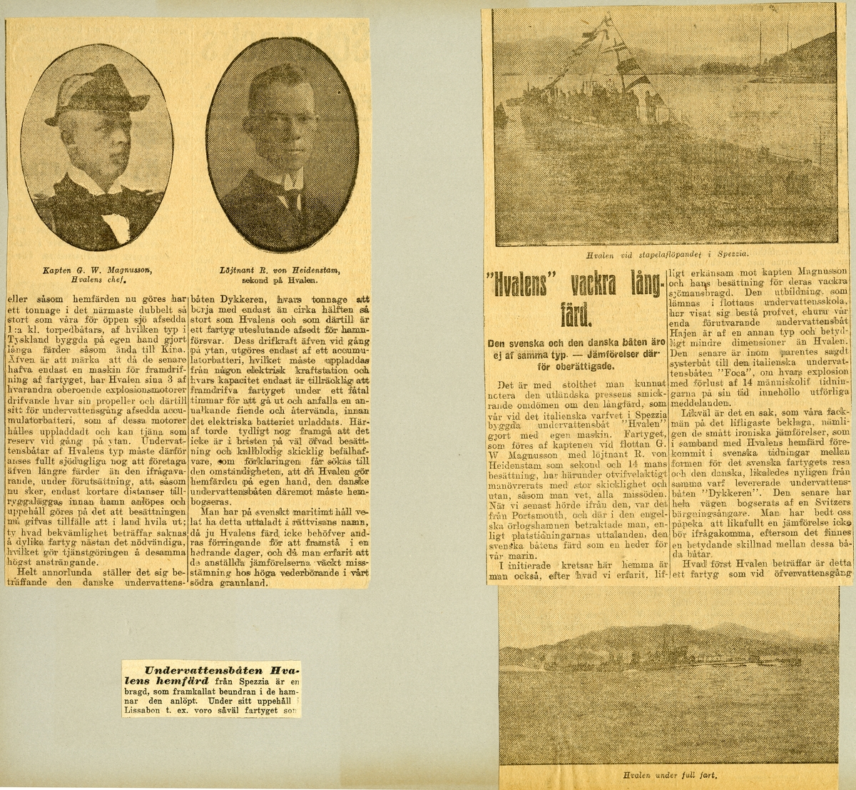Titel: Tidningsurklipp om ubåten HVALENs hemfärd till Sverige från Italien.
