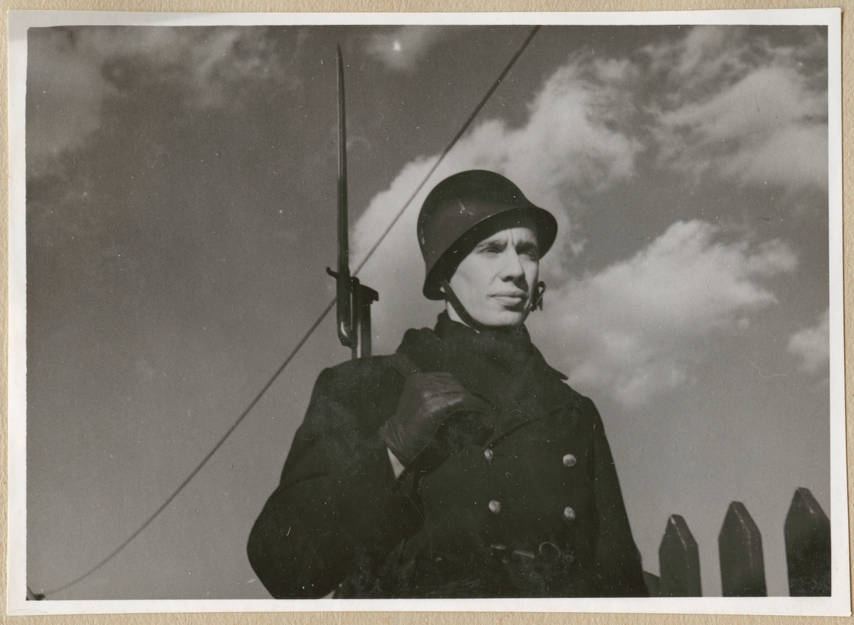 Titel: Närbild på en soldat i uniform och hjälm. På axeln har han ett skjutvapen med bajonett.