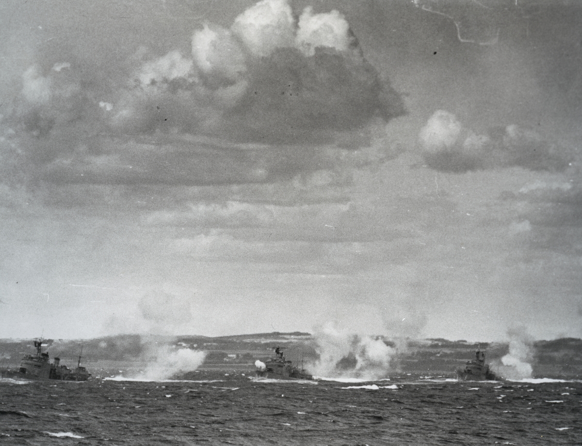 Tre jagare övningsskjuter. i Bakgrunden skymtar land. Bilden är tagen i samband med "Operation kullen" 1955.