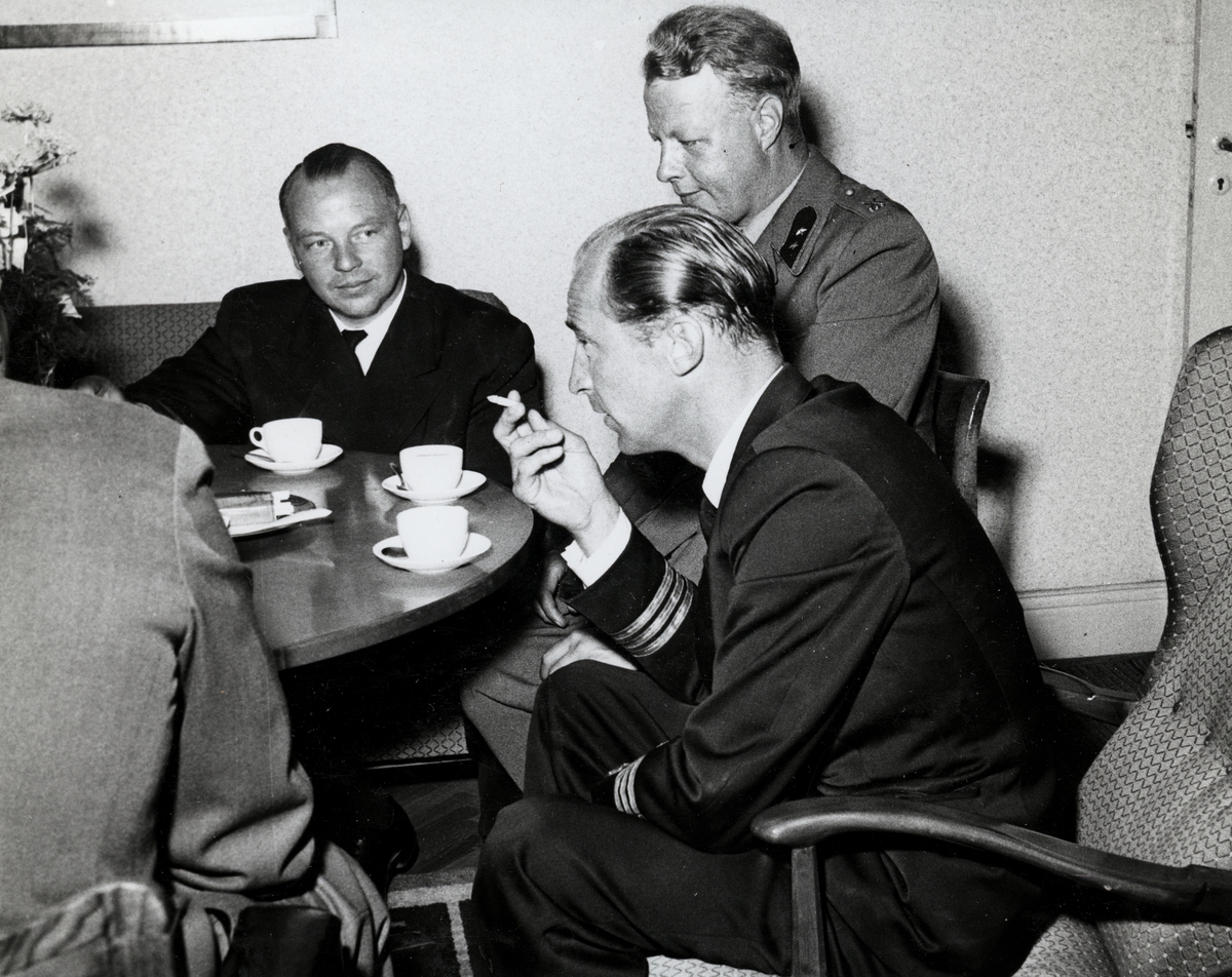 Titel: En grupp män sitter runt ett kaffebord. Tre koppar syns på bordet. En av männen håller i en cigarett.